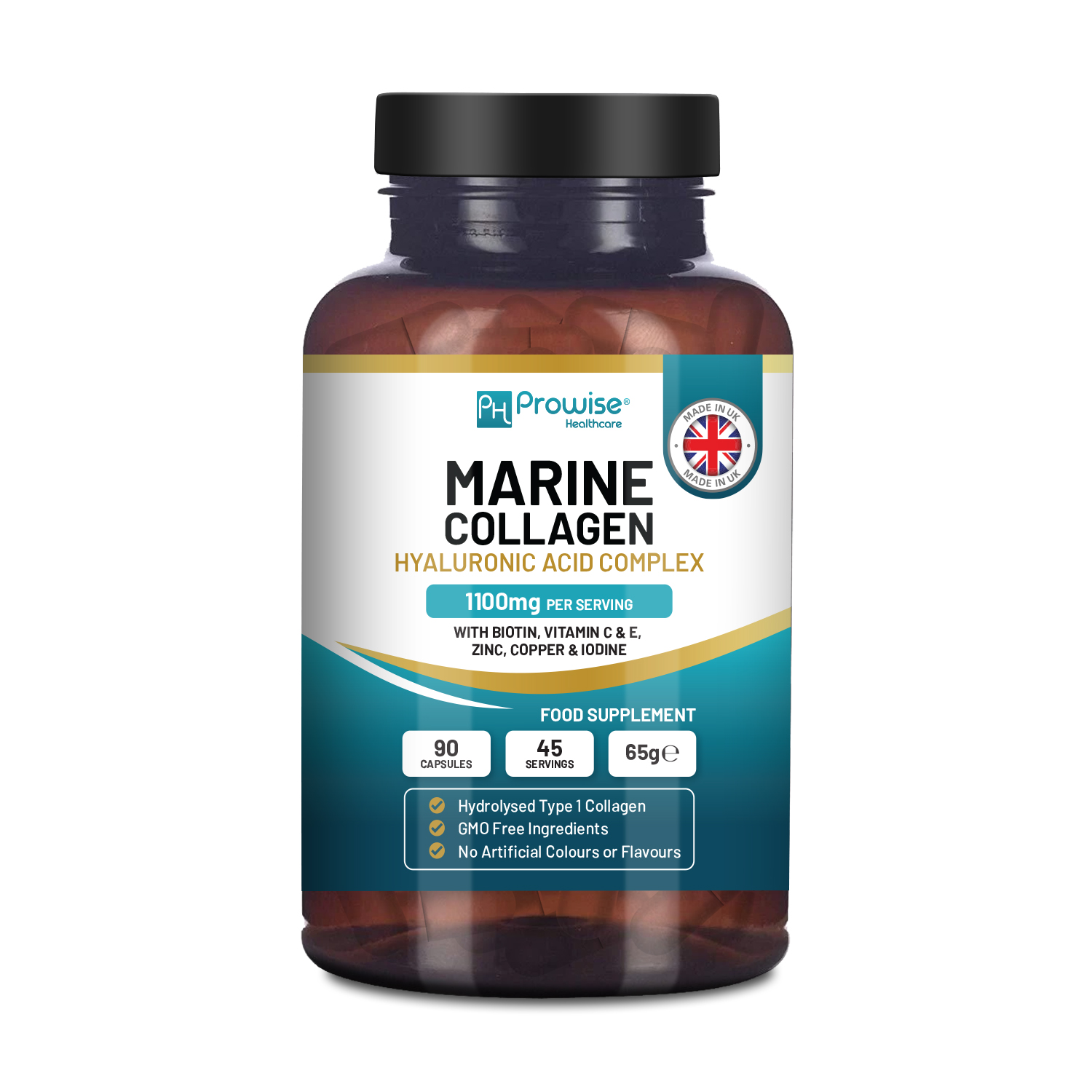 Marine Collagen with Hyaluronic Acid Complex 1100mg 90 Capsules I For Women and Men I Made in UK by Prowise