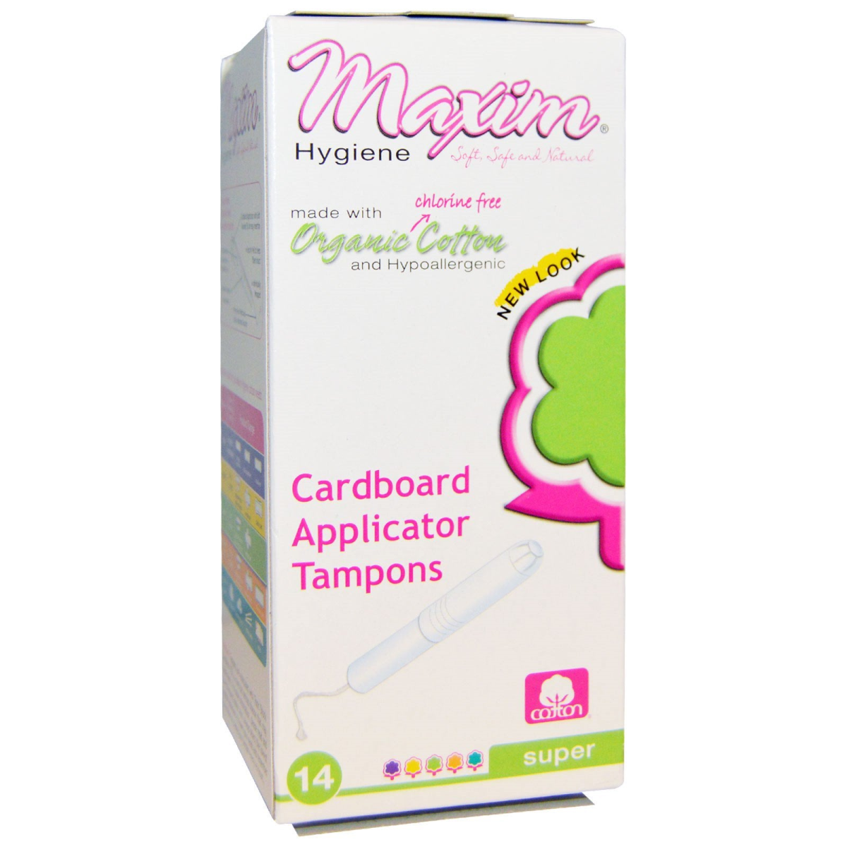 Soft, Safe and Natural Made with Chlorine Free Cotton and Hypoallergenic Certified by ICEA (GOTS) Maxim Hygiene provides a comprehensive line of and natural cotton products to keep you Soft, Safe and Natural. Why Choose Cotton? What looks like Cotton in other products is not always 100% Cotton. It is usually a blend of Wood Pulp and Synthetics, like rayon and viscose. Products made with and natural cotton are hypoallergenic, non-irritant and feel softer. They are also better for the environment because cotton's a more renewable resource. Maxim Hygiene's commitment to good health and sustainability is evident in this product's key features and benefits: Chlorine Free - No chlorine bleaching. Instead, we use hydrogen peroxide as a natural disinfectant. Hypoallergenic - Unlike synthetics, the natural breathable qualities of 100% cotton can lower the risk of irritation. Also, good for sensitive skin. Modern Fit - Maintaining products performance while keeping your health and environment safe. Eco-Friendly - Decomposes easily for less waste. Unique Designs for More Comfort and Better Protection 100% Certified Cotton Absorbent Core Cardboard Applicator with Soft Rounded Tip for Easy Insertion Finger Grip Grooves for Easy Insertion Firmly Sewn Withdrawal Cord for Maximum Security Security Veil to Keep Fibers Intact