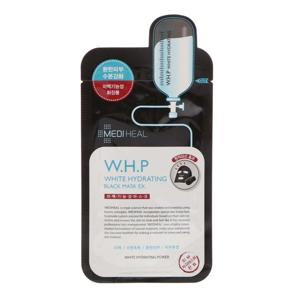 Whtie Hydrating Power 'Mediheal' is mask science that was created and tested by using beauty principles. 'Mediheal' incorporates special skin know-how to provide custom solution for individuals based on their skin concerns and renews the skin to look and feel like it has received professional skin management. 'Mediheal' uses a highly concentrated formulation of natural materials, helps you unbalanced skin become healthier by making it resistant to stress and caring skin balance. Whitening and moisturizing power mask sheet includes the ingredients excellent in whitening, Niacinamide, Euterpe oleracea fruit extract and great moisturizing effect ingredients such as skin Aquaxyl (Xylityl glucoside, Anhydroxylitol and xylitol). The black masksheet emitting farinfrared radiation on skin increases skin elasticity.