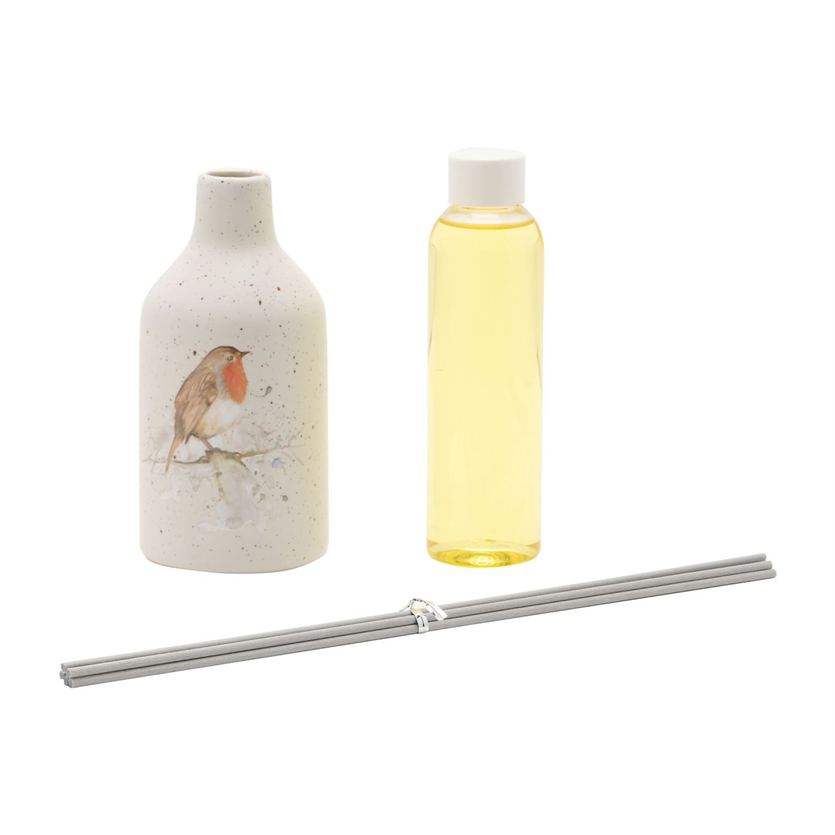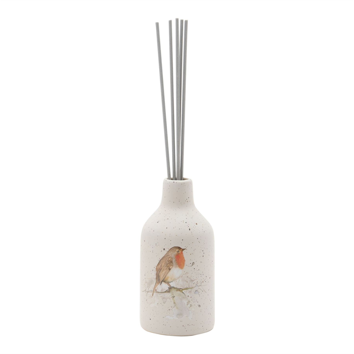 The ceramic diffuser holder showcases a white speckled finish, complete with printed robin illustration and grey reeds sticks. It houses a beautifully scented orange and cinnamon fragrance.