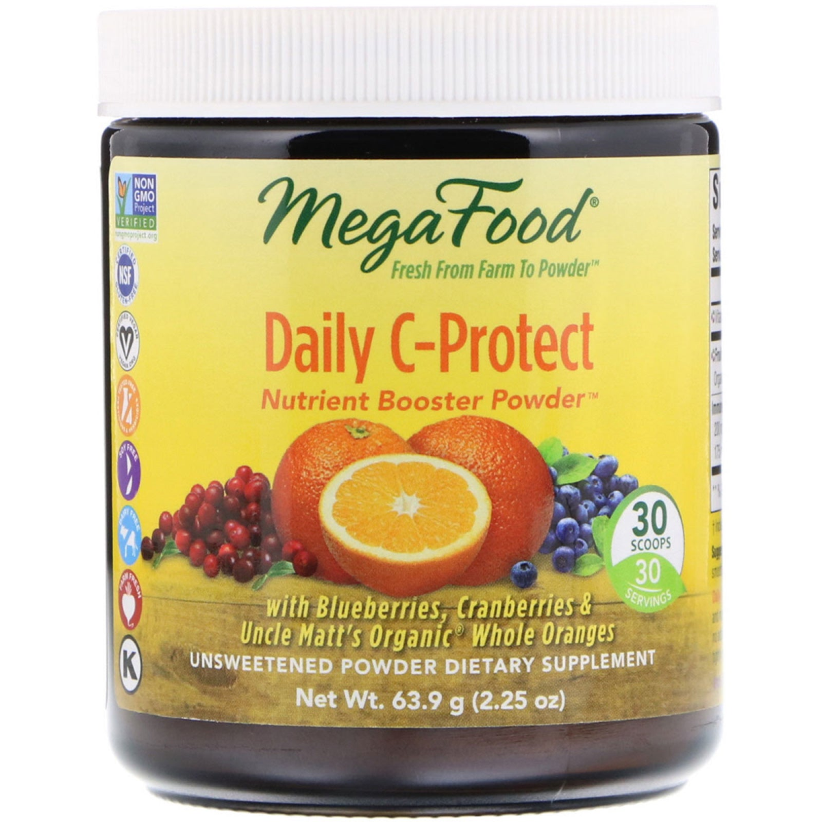 Glyphosate Residue Free* Non-GMO Project Verified NSF - Certified Gluten-Free Certified Vegan Tested Free of Pesticides & Herbicides Soy Free Dairy Free Farm Fresh Kosher Fresh From Farm to Powder 30 Scoops 30 Servings With Blueberries, Cranberries & Uncle Matt's Organic Whole Oranges Unsweetened Powder Dietary Supplement Daily C-Protect Nutrient Booster Powder Elevate your day! As delicious and good-for-you as smoothies, shakes, greens, and fresh juices are, it's now possible to boost your nutritional intake with just one scoop of any MegaFood Nutrient Booster Powder. Wholesome, pure and unsweetened, they are made with FoodState Nutrients, whole herbs, and colorful, farm fresh foods to nourish vitality and well-being. Daily C-Protect provides your body with the nourishment it needs to support your natural immune defenses. FoodState Vitamin C and farm-fresh super fruits, including blueberries and cranberries, provide phytonutrients such as bioflavonoids and anthocyanins which function as powder antioxidants. Adding to the vital efficacy of the formula are Organic Astragalus Root and Schisandra Berry - herbs traditionally used for their immune-supportive properties. *Based on government limit of detection protocols.