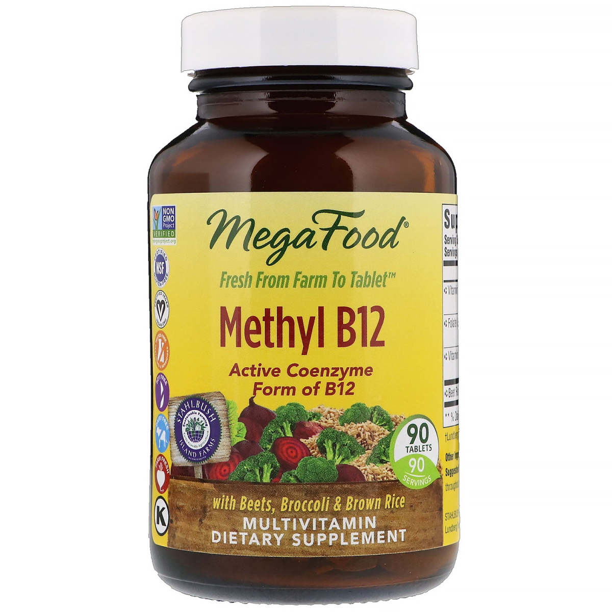 Glyphosate Residue Free NSF- Certified Gluten Free Certified Vegan Pesticides & Herbicides Tested Free Soy Free Dairy Free Farm Fresh Non-GMO Kosher Fresh From to Tablet Stahlbush Island Farms - Sustainable Farming Earth Friendly Agriculture Active Coenzyme Form of B12 90 Servings With Beets, Broccoli & Brown Rice Multivitamin Dietary Supplement MegaFood is proud to partner with Stahlbush who supplies the nourishing beet root included in our Methyl B12 formula. Stahlbush Island Farms, located in the heart of Oregon's Willamette Valley, is an environmentally friendly farm committed to sustainable and organic agriculture. "We put our heart and soul into ensuring that our land will be fertile, healthy, and bountiful for future generations, "says Karla S. Chambers, Stahlbush Co-Owner. This MegaFood product is made with real food sourced from our trusted family farm partners, wholesome nutritional yeast, added nutrients and carefully selected herbs. Each vitamin or mineral is paired with an ideal whole food using our unique process to deliver guaranteed potency and the benefit of health promoting compounds present in the whole food itself.