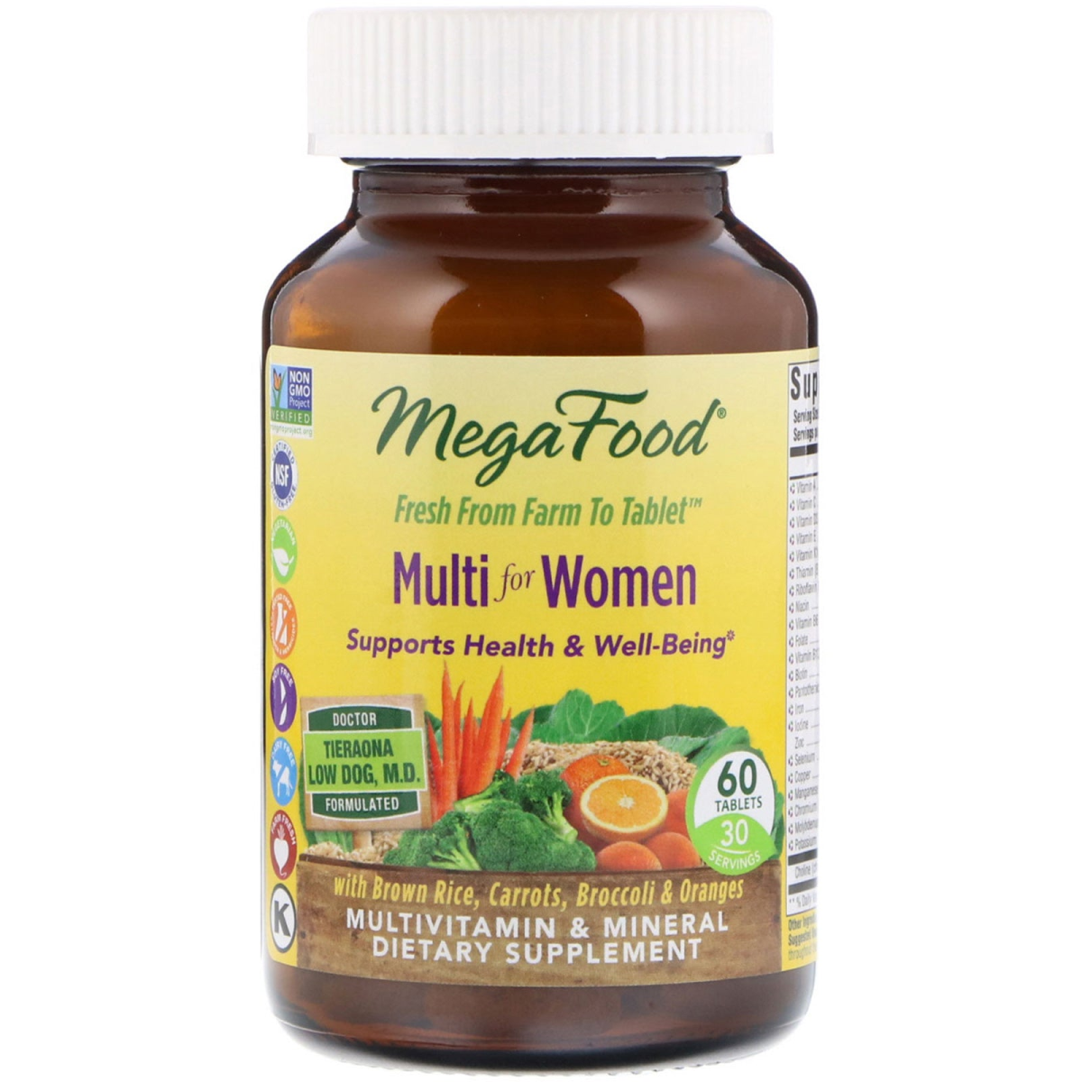 Non-GMO Project Verified NSF - Certified Gluten-Free Vegetarian Tested Free of Pesticides, Herbicides Soy Free Dairy Free Farm Fresh Kosher Fresh From Farm To Tablet Supports Health & Well-Being Doctor Formulated - Tieraona Low Dog, M.D. 30 Servings With Brown Rice, Carrots, Broccoli & Oranges Multivitamin & Mineral Dietary Supplement