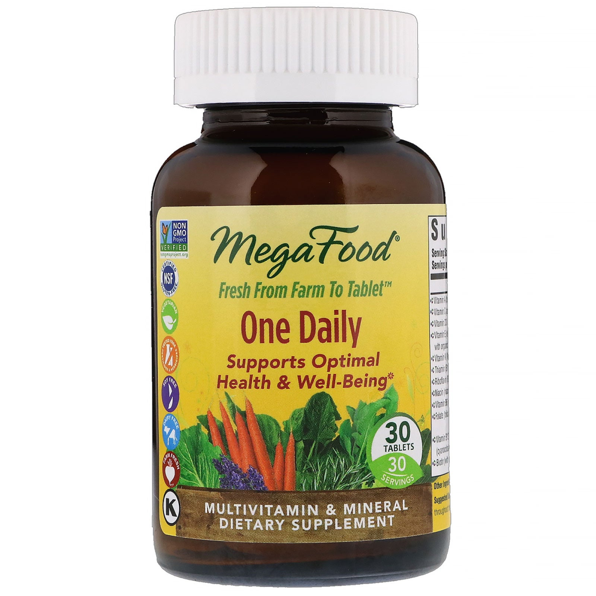 Glyphosate Residue Free Fresh From Farm To Tablet Supports Optimal Health & Well-Being 30 Servings Multivitamin & Mineral Dietary Supplement Non-GMO Project Verified NSF - Certified Gluten-Free Vegetarian Tested Free Of Pesticides & Herbicides Soy Free Dairy Free Farm Fresh Kosher
