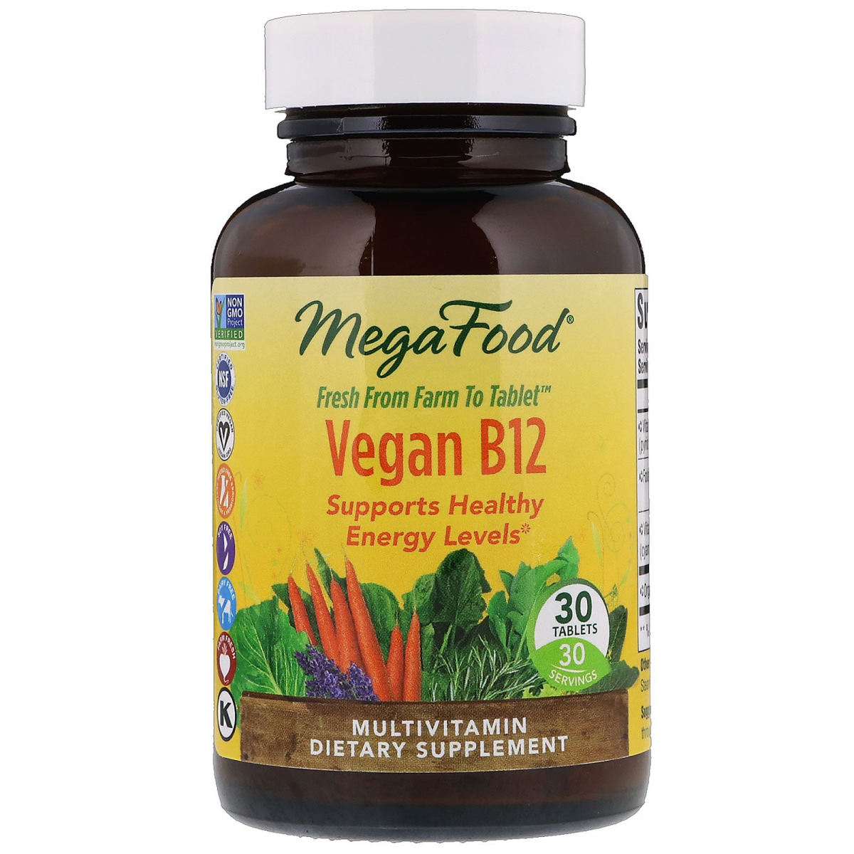 Glyphosate Residue Free* Fresh From Farm to Tablet Supports Healthy Energy Levels 30 Servings Multivitamin Dietary Supplement Non GMO Project Verified Certified NSF Gluten-Free Certified Vegan Tested Free - Pesticides & Herbicides Soy Free Dairy Free Farm Fresh Kosher ♦This Mega Food product is made with real food, wholesome nutritional yeast and added nutrients. Each vitamin is paired with an ideal whole food to deliver guaranteed potency and the benefit of health-promoting compounds present in the whole food itself. *Based on government limit of detection protocols.