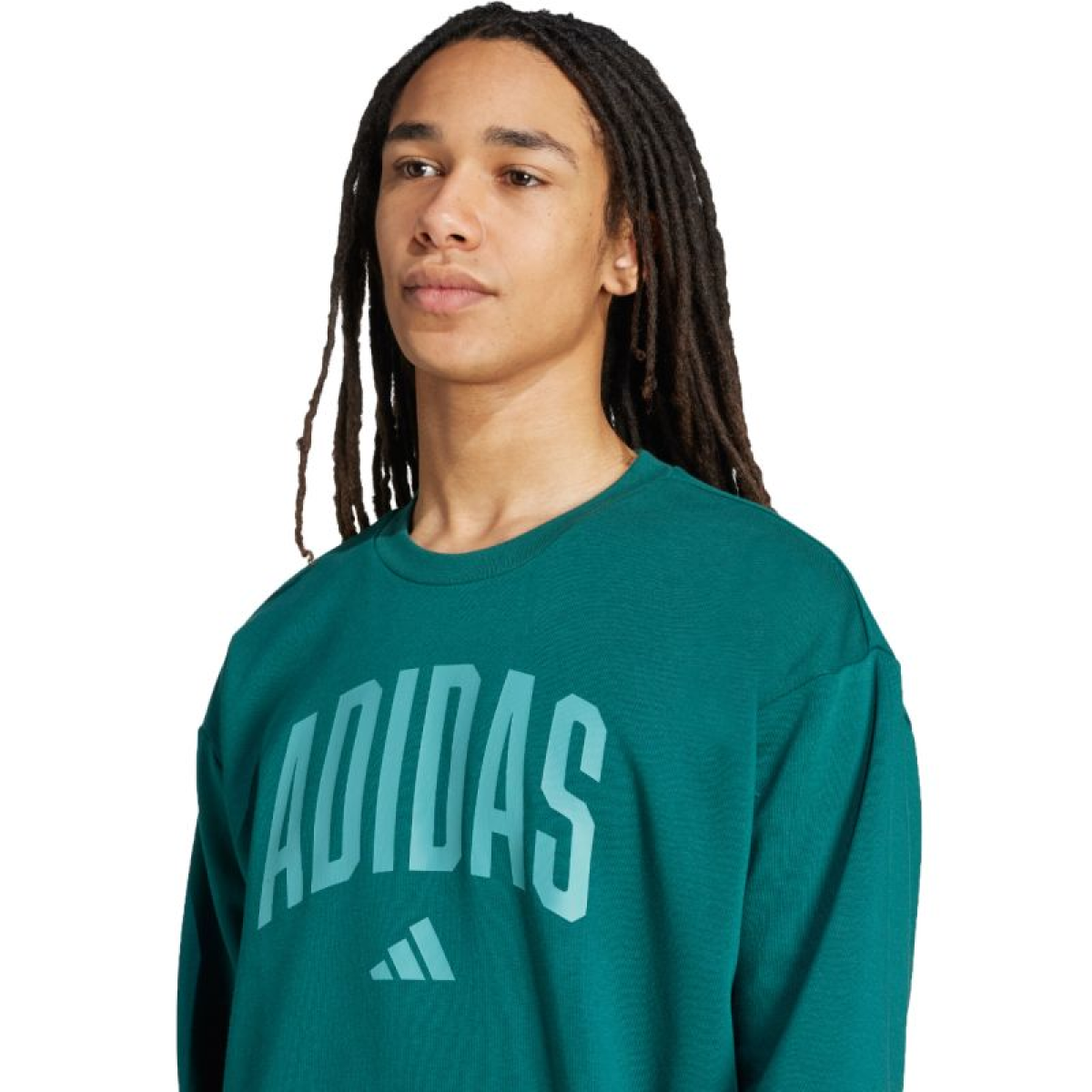 adidas Collegiate Sweatshirt, Green JM1733. This adidas men's sweatshirt, inspired by collegiate style, is perfect for everyday wear. It features a soft cotton and polyester blend. It has a regular fit. Ribbed cuffs and hem help keep you warm. Material: 70% cotton, 30% recycled polyester