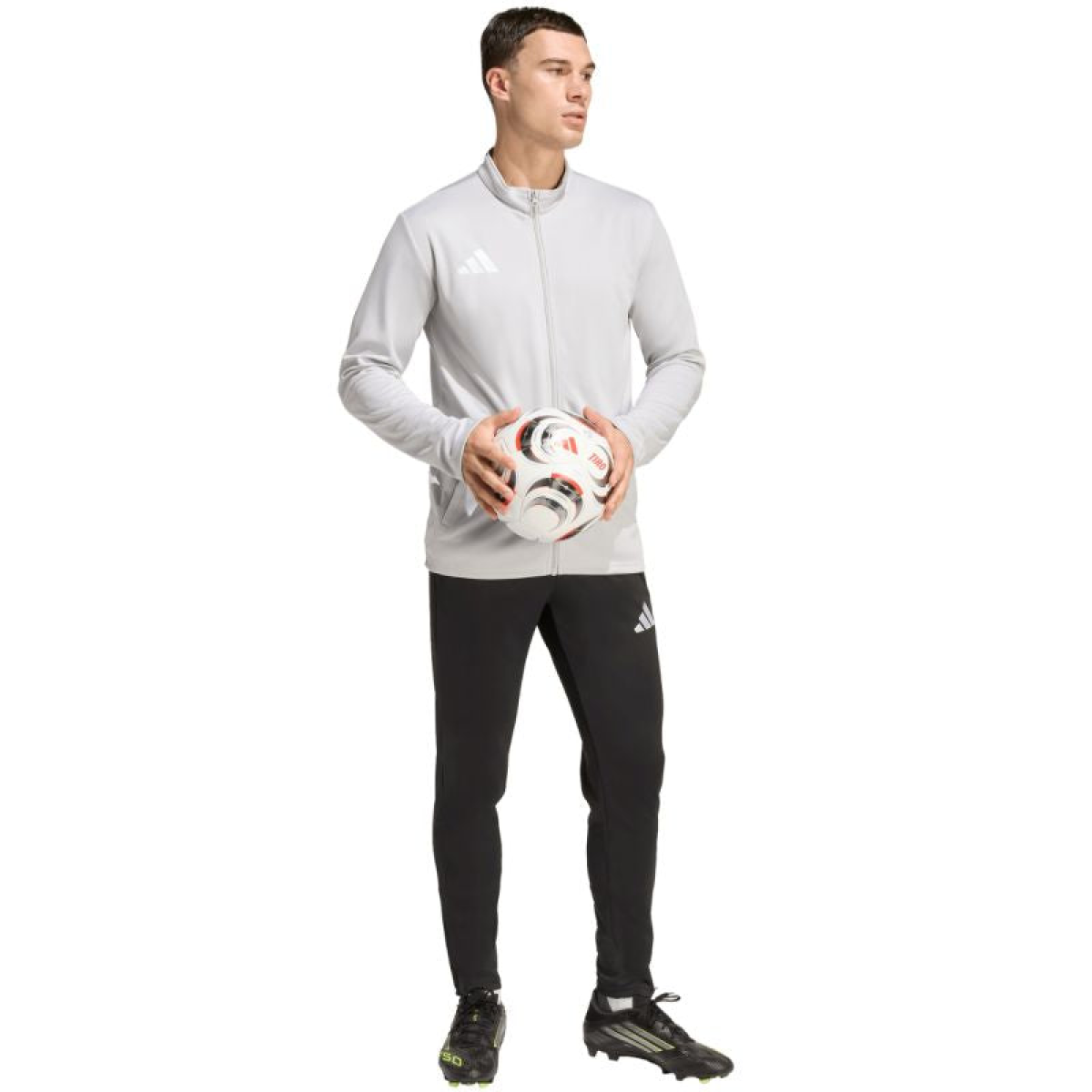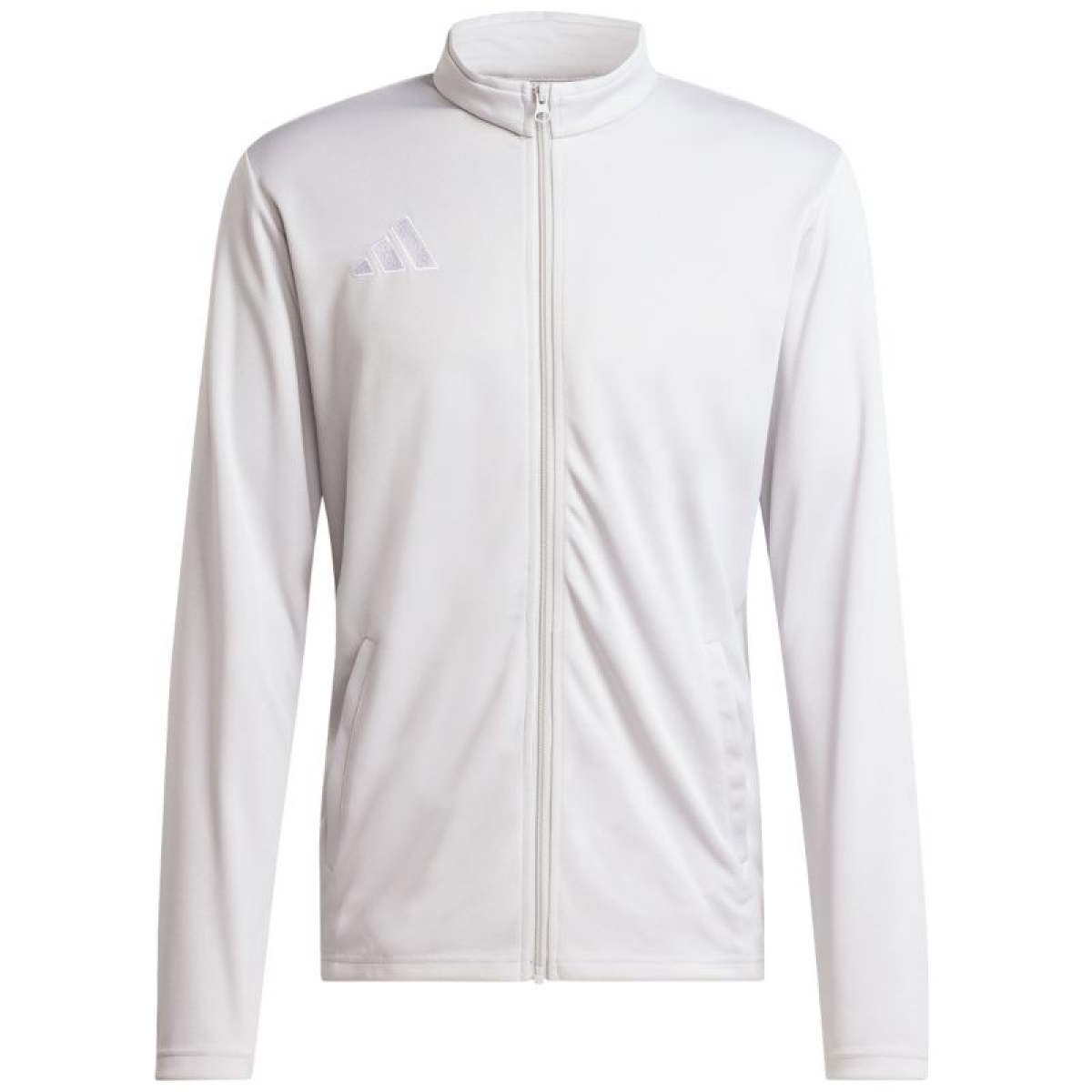 Men's adidas Entrada 26 Track Sweatshirt, Gray JZ6592. This men's adidas sweatshirt is perfect for training. Slim fit. Full-length zipper. Climacool technology absorbs and wicks away sweat. Quick-drying material. Open side pockets. Embroidered logo. Stand-up collar. Material: 100% recycled polyester