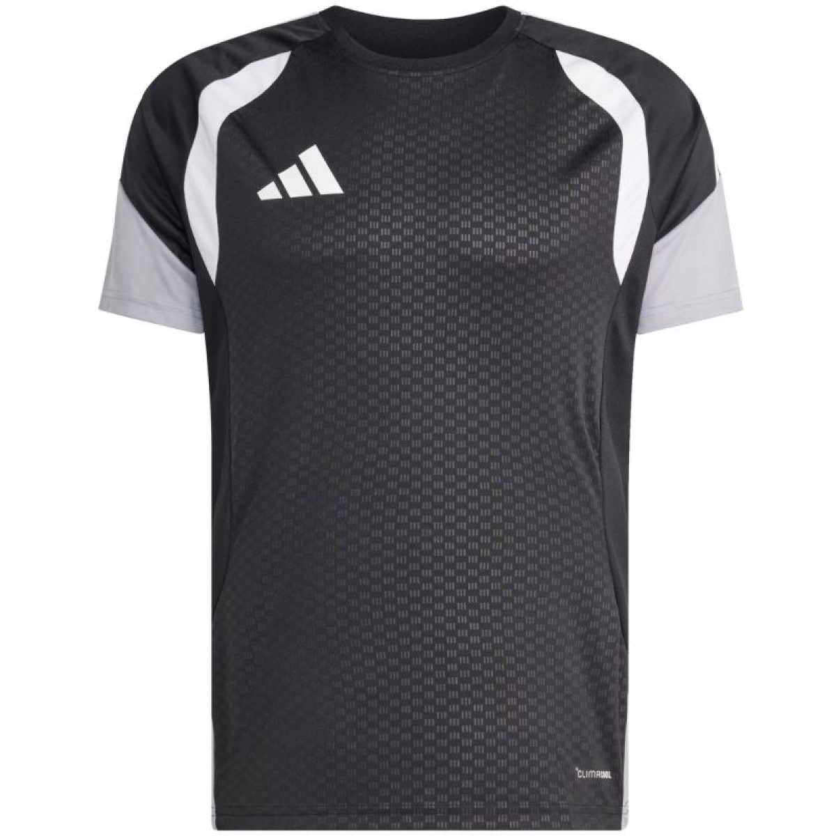Men's adidas Tiro 26 Competition Training Jersey in Black, Gray, and White JX4254. This adidas men's jersey is perfect for training. It has a slim fit and a crew neckline. Cllimacool technology wicks and disperses sweat, keeping you cool and dry. Recycled fibers are used. Embossed pattern on the front panel. Material: 100% recycled polyester.