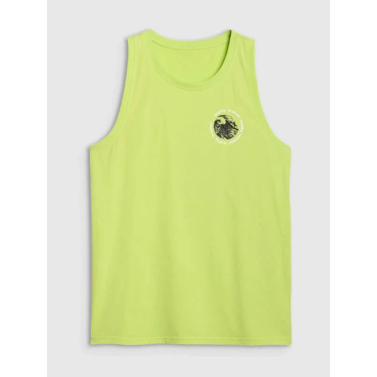 Featuring a round neckline with a slight ribbed detail and wide armholes , it features a " Salty Water " print on the front, evoking a summery vibe.