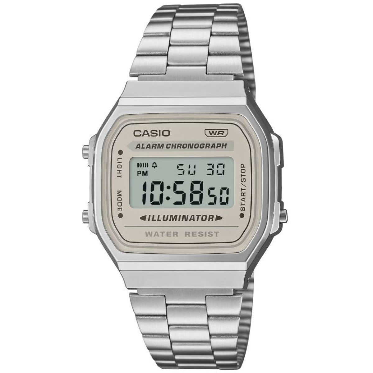 This watch isn't just a timekeeper—it's a statement of style. With the Vintage collection, CASIO brings to the modern era the atmosphere of bygone days, when design had soul and simplicity meant class. The dial, framed by a subtly shimmering chrome case, evokes associations with industrial elegance—raw yet refined. The square shape and geometric purity of form give it a character—subtle yet expressive. Thanks to its compact dimensions and lightweight construction (just 50g), it almost blends with the wrist, providing a feeling of natural comfort. This model features standard digital time display: hour, minute, second, time of day (PM), date, and day of the week. And when the moment comes, it has everything you need. A 1/100-second stopwatch , split time function, daily alarm, and hourly time signal—practical tools in a sleek design. In the evening, when the light dims, just one press is enough – the electroluminescent blue-green backlight will brighten the dial and give it a unique atmosphere.
