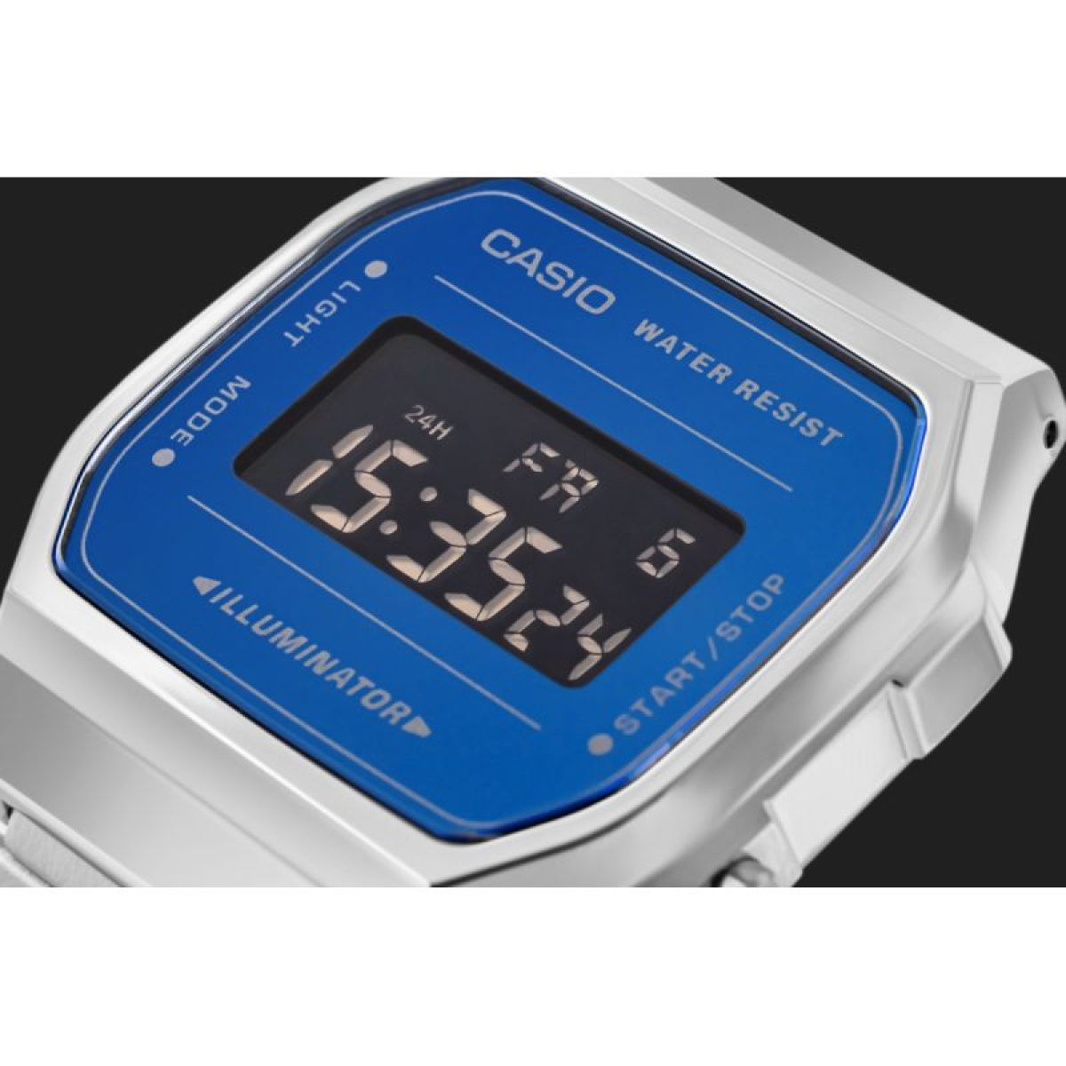 You don't need flashy accessories to grab attention. A classic Casio silhouette meets a modern finish here – the mirrored dial in metallic navy blue catches the eye, reflecting light with a distinctive shine that impresses in every situation – from the office to a night out. This model features standard digital timekeeping: hour, minute, second, time of day (PM), date, and day of the week. And when the moment comes, it has everything you need. A 1/100-second stopwatch , split-time function, daily alarm, and hourly time signal – practical tools in a sleek design. In the evening, when the light fades, a single press is all it takes – the electroluminescent blue-green backlight illuminates the dial, giving it a unique ambiance. This model is also splash-proof – because life doesn't ask if you have an umbrella.