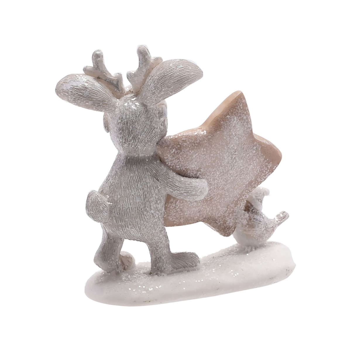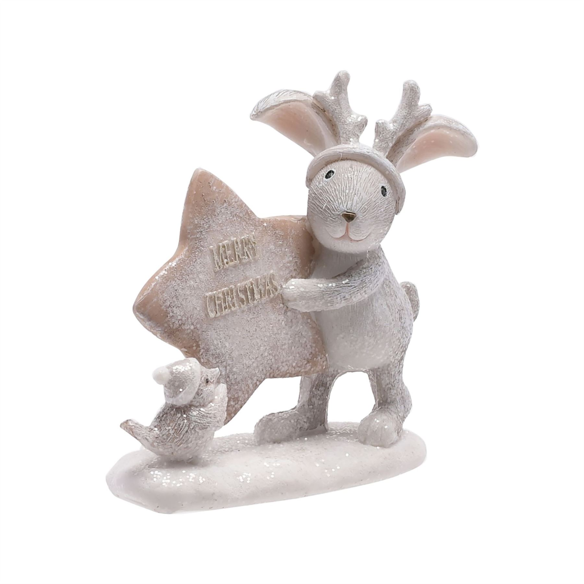 The grey resin ornament showcases a bunny and robin carrying a �Merry Christmas� star together. It is completed by a vintage glitter finish.