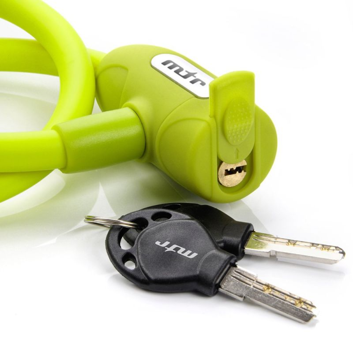 This durable bicycle lock features a 4.5 mm diameter steel cable with a plastic coating. Two keys are included. The lock is equipped with a cover to protect the mechanism from dirt.