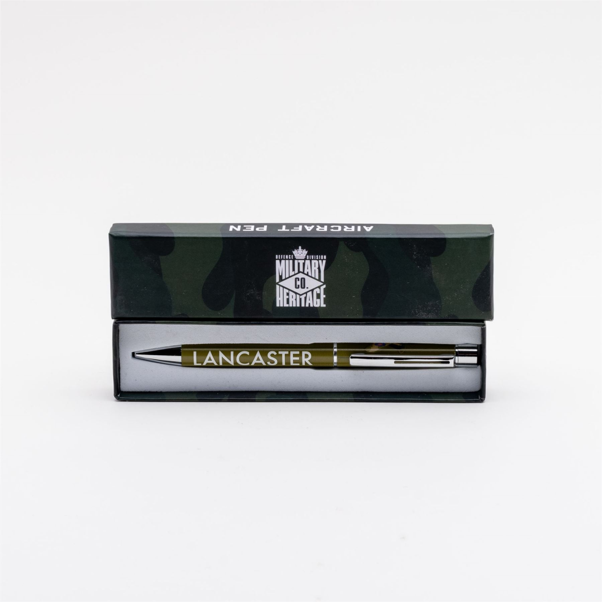 The pen features a vintage style Lancaster illustration from Stephen Millership along with LANCASTER title on the camo green barrel. The pen includes chrome finish trim and a twist cartridge with black ink.