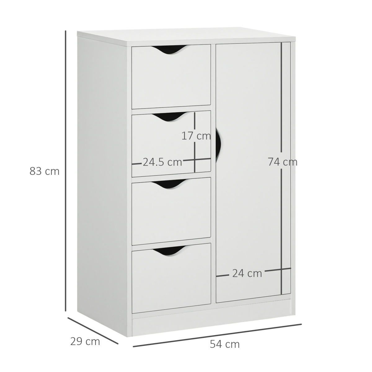 Duo-storage design: This cupboard comes with four drawers and a side cupboard. Cupboard comes with shelf for extra organisation.Modern: A clean white storage cabinet for a contemporary look - versatile and pairs well with other furniture.Sturdy: Hallway storage unit is made from particle board - durable, can be used everyday.Anti-tipping straps: Attach this sideboard storage cabinet to a wall for safety - suitable for family homes.Dimensions: 83H x 54W x 29Dcm. Maximum load 40kg. Assembly required.