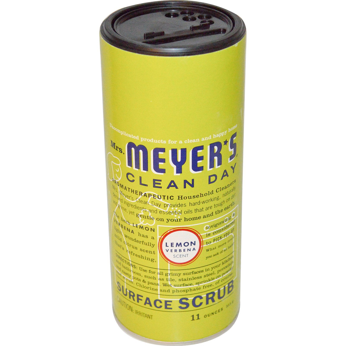 Uncomplicated Products for a Clean and Happy Home Aromatherapeutic Household Cleaners Mrs. Meyer's Clean Day provides hard-working, naturally derived ingredients and essential oils that are tough on dirt and grime, yet gentle on your home and the earth. The herb Lemon Verbena has a light, wonderfully mild citrus cent that's refreshing, invigorating & is considered to Pick-You-Up. What more could you ask of an herb? Household Hint: If you're facing a difficult stain, sprinkle our powdered scrub on a wet surface, lightly scrub and let sit for a few minutes. Make yourself a cup of coffee, finish reading the paper, and then return for a final scrub. Your worries and stains will disappear.