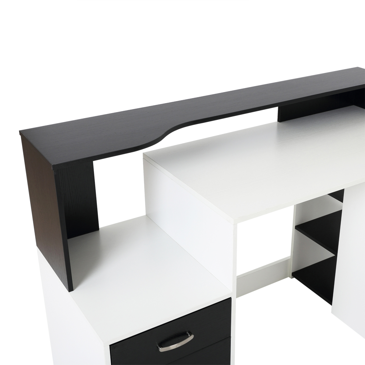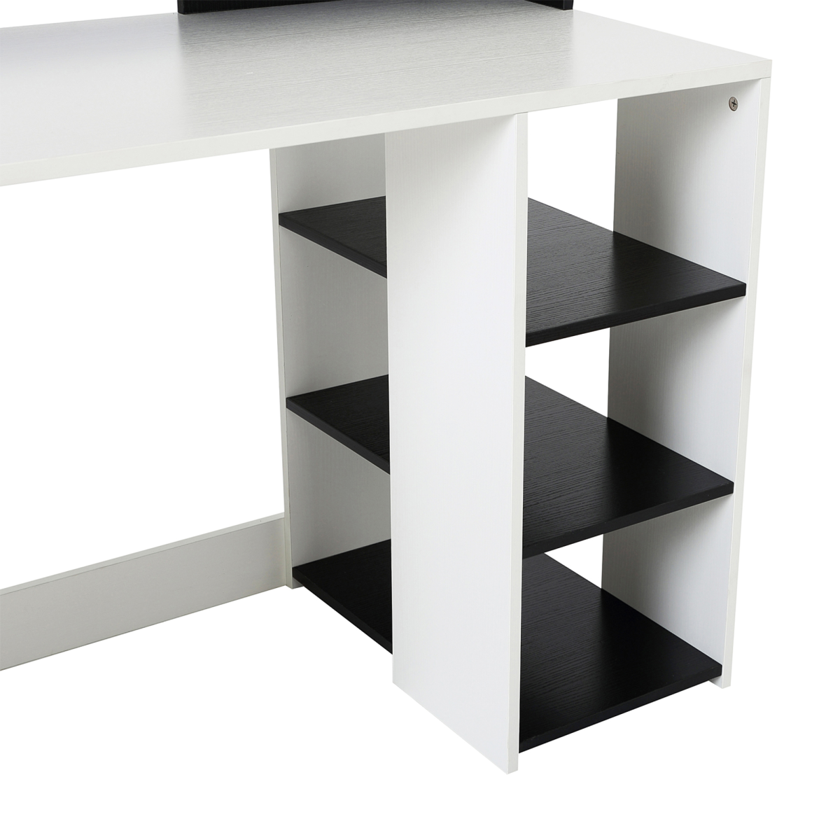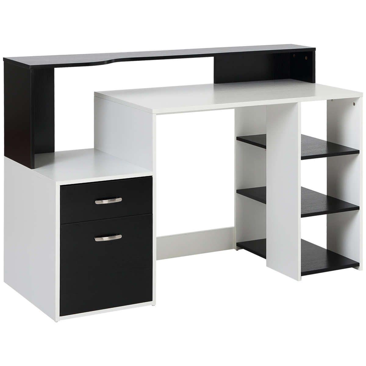 Modern style: Elegant desk with shelves will add a stylish atmosphere to your home, and will blend seamlessly with your other furniture.Large storage space: Features three shelves, two drawers and large worktop, the home office desk provides large room to work from and store your work essentials.Solid construction: Crafted from MDF, the PC desk frame is solid and durable to work from and store your work supplies.Dimensions: 92H x 137L x 55Dcm.Maximum load 50kg, assembly required.