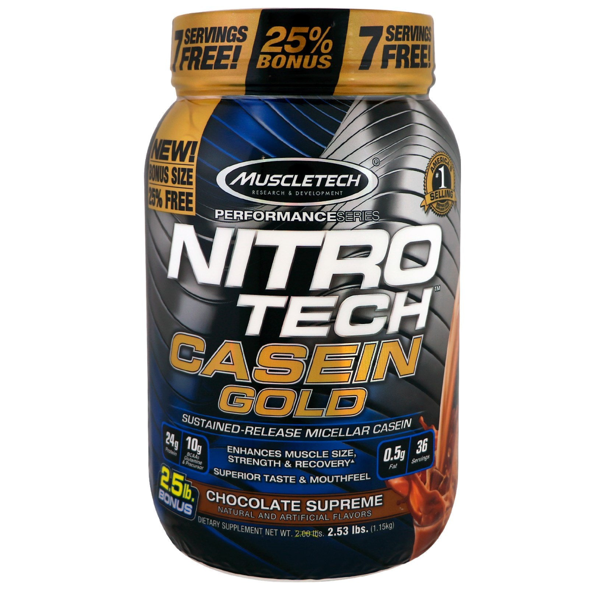7 Servings Free! 25% Bonus Bonus Size 25% Free Research & Development Performance Series America's #1 Selling Body Building Supplement Brand‡ Sustained-Release Micellar Casein 24 g Protein 10 g BCAAs Glutamine & Precursor Enhances Muscle Size, Strength & Recovery Superior Taste & Mouthfeel 0.5 g Fat 36 Servings 2.5 lb. Bonus Natural and Artificial Flavors Dietary Supplement Gluten Free #1 Most Award Winning Sports Nutrition Brand #1 Most Scientific Studies in Science American Masters of Taste Gold Medal Superior Taste 20 Years of Excellence Guaranteed Banned Substance Free cGMP Manufactured - Manufactured According to cGMP Standards, as is Required for all Dietary Supplements If you're serious about performance and results, you need the All-New MuscleTech Performance Series! No Proprietary Blends No Fillers No Underdosed Key Ingredients No Hype No Banned Substances No Exceptions Just the Most Powerful Formulas Available Prolonged-Release Premium Casein Protein For decades MuscleTech has been a leading protein brand. Built on a foundation of human research and cutting-edge science, it's earned the trust of countless consumers worldwide. Now the same research and development team has pioneered a new slow-release protein formula based on superior protein sources for longer absorption and better taste. 8-Hour, Sustained Amino Acid Delivery Enhance your recovery with sustained nutrient release. Casein and milk protein are some of the slowest digesting proteins available. Nitro-Tech Casein Gold delivers 24 g of high-quality protein taken from multiple premium casein sources, including primarily micellar casein. In fact, the protein source used in Nitro-Tech Casein Gold has been shown in research published in The America Journal of Clinical Nutrition to release amino acids into your bloodstream for up to 8 hours after taking it.¹ Because of this sustained-release property, its highly anabolic and anti-catabolic formula promotes a musclebuilding environment for longer periods of time. What's more, each enhanced serving of Nitro-Tech Casein Gold contains 10 g of naturally occurring BCAAs, glutamine and precursor, and only 1 g of sugar. Combined with an award-winning flavor profile, Nitro-Tech Casein Gold is as good for your taste buds as it is for your muscles. The Superior-Tasting Protein Formula Slow-digesting protein blend to support prolonged amino acid release to continuously feed your muscles Features the most premium casein protein blend for superior amino acid profile 10 g of anabolic BCAAs, glutamine and precursor for better muscle protein synthesis and recovery Superior cold-processed, ultra-pure micro-filtered protein blend featuring micellar casein Compared to typical casein powders, Nitro-Tech Casein Gold has a better texture for a superior flavor profile Superior to the Competition ProductProtein CarbsFat%Protein CaloriesServings Nitro-Tech Casein Gold24 g2 g0.5 g75%11036 Other24 g 3 g1 g71%12026 ‡MuscleTech is America's #1 Selling Bodybuilding Supplement Brand based on cumulative wholesale dollar sales 2001 to present.