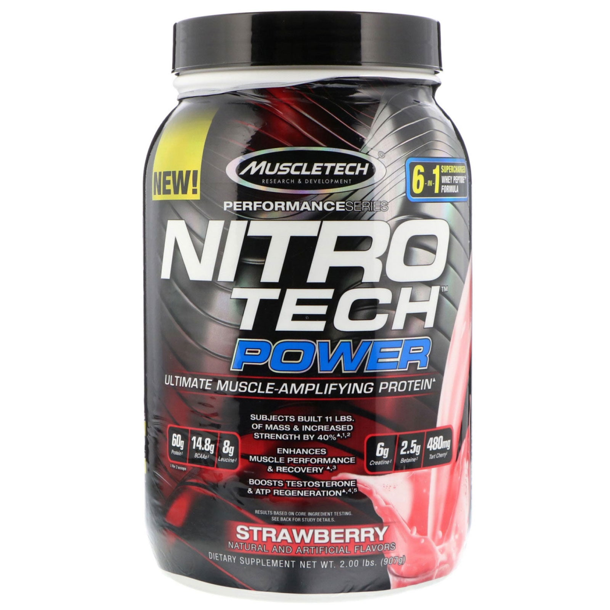 Research & Development Performance Series 6-in-1 Supercharged Whey Peptide+ Formula Subjects Built 11 lbs of Mass & Increased Strength by 40%¹,² Enhances Muscle Performance & Recovery³ Boosts Testosterone & ATP Regeneration4,5 60 g Protein ‡ 14.8 g BCAAs‡ 8 g Leucine ‡ 6 g Creatine ‡ 2.5 Betaine †480 mg Tart Cherry ‡ Natural and Artificial Flavors Dietary Supplement Americans #1 Selling Bodybuilding Supplement Brand ♦ Made in the USA from Domestic & International Ingredients #1 Most Award Winning Sports Nutrition Brand #1 Most Clinical Studied in Science American Master of Taste Gold Medal Superior Taste 20 Years of Excellence Guaranteed Banned Substance Free cGMP Manufactured - Manufactured According to cGMP Standards, as is Required to all Dietary Supplements If you're serious about performance and results, you need the All-New MuscleTech Performance Series! No Proprietary Blend No Underdosed Key Ingredients No Banned Substances No Fillers No Hype No Exceptions Superior Science. Superior Results. The Ultimate Muscle-Amplifying Protein Nitro-Tech Power is the latest musclebuilding innovation from MuscleTech, the brand with over 20 years of excellence. Nitro-Tech Power contains several key ingredients shown in multiple clinical studies to help you pack on more muscle than ever. See the research for yourself! Scientifically Superior Musclebuilding Protein ¹To create a the ultimate musclebuilding protein, MuscleTech researcher started by packing a researched dose of 6 g creatine into every 2 scoops of Nitro-Tech Power. In a double-blind, placebo-controlled study, subjects supplementing with this same dose of creatine gained 11 lbs of mass in 12 weeks (versus 7.5 lbs for the placebo group). Nitro-Tech Power also contains a scientifically validated 2.5 g dose of betaine (per 2 scoops), which has been shown in multiple studies to increase strength and lean muscle. In a gold-standard study, subject gained 3.75 lbs of muscle in 6 weeks (vs. 0.66 lbs. for the placebo) - an incredible 5 times the muscle! Increased Muscle Strength and Amplified Recovery ²This super-engineered formula is loaded with 14.8 g of BCAAs, including 8 g of high anabolic leucine (in 2 scoops), and, is sure to ignite protein synthesis and put your body in a prime anabolic state. The amount of leucine found in just one scoop of Nitro-Tech Power has been scientifically shown to increase strength by over 40%! ³What's more, this complete formula also feature the 480 mg dose (per 2 scoops) of tart cherry powder that has been shown in emerging research to improve recovery through the reduction of muscle soreness post-exercise. Enhanced ATP Regeneration and Free Testosterone Support 4Nitro-Tech Power delivers a potent dose of creatine, which research has shown can help your body regenerate ATP energy stores depleted during resistance training. 5MuscleTech researchers also included the scientifically studied 200 mg dose of boron citrate (per 2 scoops), supplying a dose of boron that has been show to decrease estradiol and increase free testosterone within the normal range in only 7 days. Nitro-Tech Power Is Superior to the Competition ProductProteinTotal BCAAsLeucine Nitro-Tech Power60 g14.8 g8 g Competitor40 g11.98 g6.66 g ProductCreatineBetaineTart CherryBoron Citrate Nitro-Tech Power6 g2.5 g480 mg200 mg Competitor2 gNoneNoneNone ‡Per 2 scoops ♦MuscleTech is America's #1 Selling Bodybuilding Supplement Brand based on cumulative wholesale dollar sales 2001 to present.