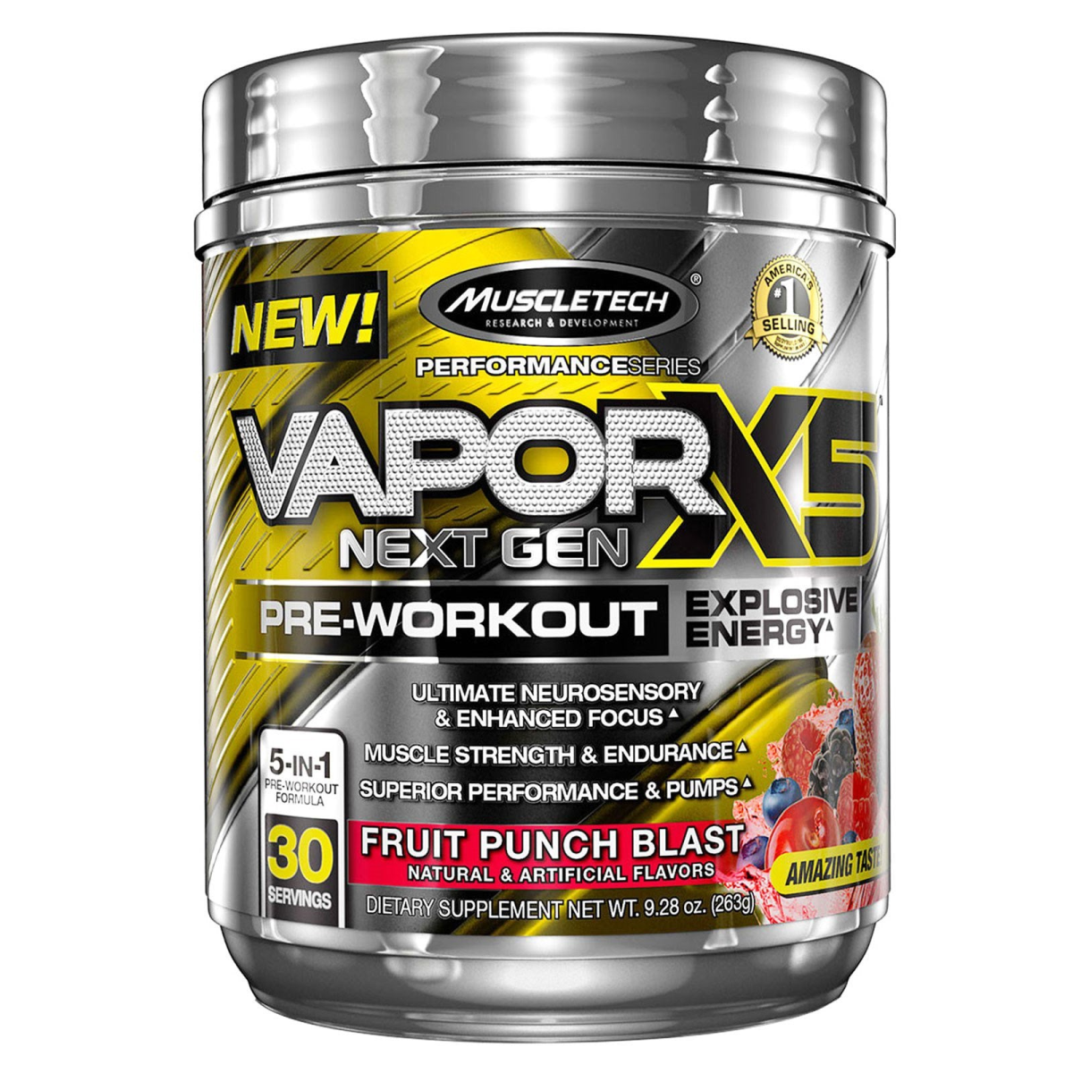 Research & Development America's #1 Selling Bodybuilding Supplement Brand‡ Explosive Energy 5-in-1 Pre-Workout Formula 30 Servings Ultimate Neurosensory & Enhanced Focus Muscle Strength & Endurance Superior Performance & Pumps Natural & Artificial Flavors Dietary Supplement Amazing Taste! CarnoSyn Nitrosigine Explosive Pre-Workout Neurosensory Experience MuscleTech researchers have reinvented the pre-workout category again. VaporX5 Next Gen is the most powerful, 5-in 1 pre-workout product available. Each two-scoop serving delivers, unparalleled energy, extreme muscle pumps, a surreal sensory experience, enhanced strength and performance, plus scientifically validated musclebuilding power! It's everything you could possibly want, in a pre-workout and nothing you don't zero underdosed key ingredients, a sugar of fillers. VaporX5 Next Gen delivers uncompromising potency and power for the best workouts of your life! Ultimate Neurosensory Experience VaporX5 Next Gen combines a unique and powerful blend of sensory ingredients with a potent dose of a precise caffeine molecule for the ultimate pre-workout experience and a sensory overload you wont's find anywhere else. Explosive Energy & Focus VaporX5 Next Gen has everything you want to get amped up for a killer workout. A precisely dosed neurotransmitter precursor is combined with a potent amount of caffeine that will fire up your energy, help power you through your hardest training sessions and enhance your focus. Scientifically Validated Musclebuilding Power VaporX5 Net Gen features powerful musclebuilding ingredients (betaine and creatine) in scientifically validated doses actually shown to build more muscle. Better Performance & Endurance To enhanced strength for better performance in the gym, MuscleTech researchers included a research-inspired dose of beta-alanine. Plus the precise dose of taurine found in two scoops has been shown in scientific research to boost performance in endurance athletes. Amplifies Nitric Oxide For Intense Muscle Pumps For shirt-splitting pump, VaporX5 Net Gen delivers a blend of Nitrosigine and hawthorn berry engineered to increase plasma nitric oxide levels, which promotes improved vasodilation. This all lead to unbelievably powerful pump! ‡ MuscleTech is America's #1 Selling Bodybuilding Supplement Brand based on cumulative wholesale dollar sales 2001 to present.