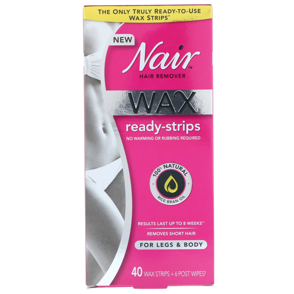 The Only Truly Ready-To-Use Wax Strips* No Warming or Rubbing Required 100% Natural Rice Bran Oil Results Last Up to 8 Weeks** Removes Short Hair 40 Wax Strips + 6 Post Wipes†No Prep Strip, Just Peel & Place Large Strips Waxing Made Easy Dermatologist Tested Helps Minimize Hair Regrowth*** *Among leading wax strips. **Individual results may vary. ***With repeated use. †20 large double-sided + 6 post wipes.