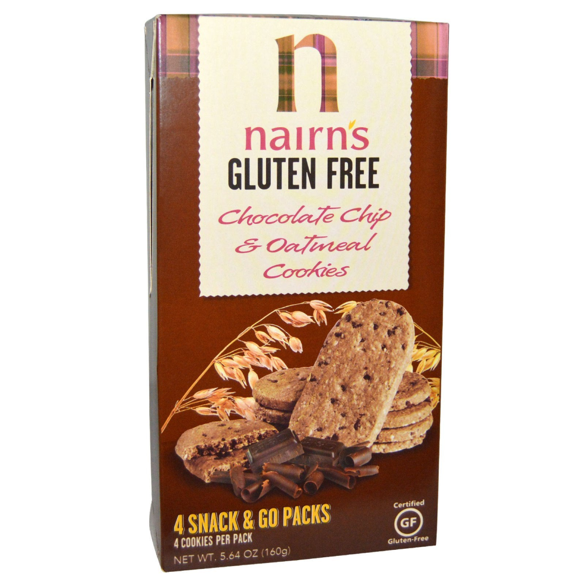 4 Snack & Go Packs 4 Cookies Per Pack Certified Gluten Free Our tasty cookies come in handy pouch packs, so are easy to pop in your bag for a snack on the go! At Nairn's we love our oats and that's why we've created a range of delicious, gluten free cookies that everyone can enjoy. Naturally oats do not contain gluten but can be contaminated by contact with other grains. We pride ourselves in carefully sourcing gluten free oats and one of our farms in Wyoming is owned by a family of Celiacs. The family not only understands the importance of following a gluten free diet, but they have made it their mission to produce oat that are safe to consume. They personally walk the fields to check for any imperfections and ensure proper care is taken during the harvesting process. Every individual truck of raw oats that enters or leaves the mill is tested each and every time. All Nairn's gluten free products are tested to Elisa standards, a system approved by GFCO, so you can enjoy your oatmeal cookies with confidence. Nairn's gluten free cookies taste so good, you wouldn't even know they are gluten free! Gluten free whole grain oat No artificial colors, flavor or preservatives 45 calories per cookie No Artificial colors, flavors or preservatives Dedicated gluten free bakery Zero trans fats Suitable for vegans