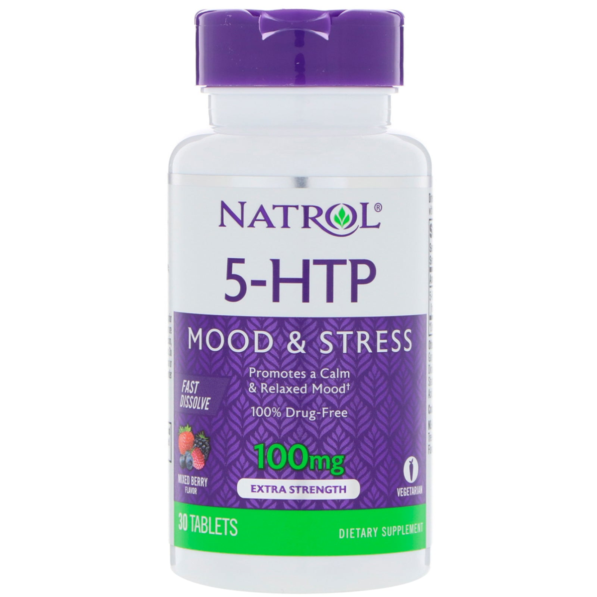 Mood & Stress Promotes a Calm & Relaxed Mood 100% Drug-Free Extra Strength Vegetarian Dietary Supplement Natrol 5-HTP 100 mg Fast Dissolve: Promotes a calm, relaxed mood and helps maintain a positive outlook. Helps reduce occasional anxiety. Enables production of Serotonin. 100% Drug-free and non-habit forming. Fast Dissolve form—take anytime, anywhere; no water needed.