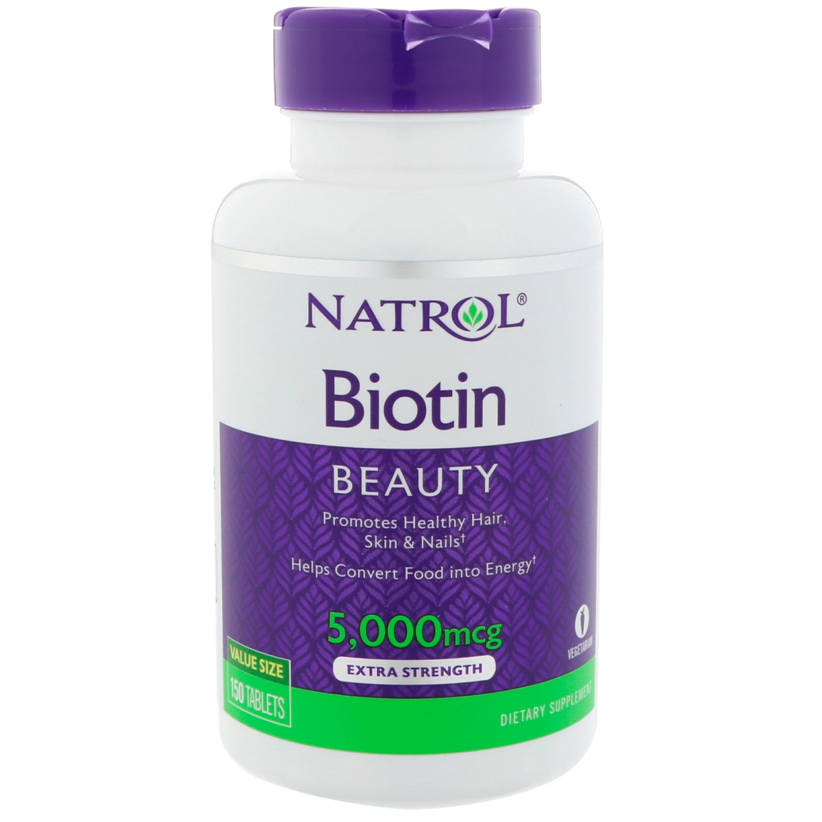 Beauty Promotes Healthy Hair, Skin & Nails Helps Convert Food into Energy Value Size Vegetarian Dietary Supplement Natrol Biotin 5,000 mcg: Promotes healthy hair, radiant skin and stronger nails. Helps support energy metabolism and aids in the conversion of food into energy. Clinical studies have shown that those deficient in Biotin can experience hair loss and brittle nails.