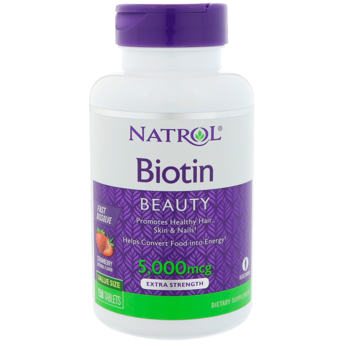 Beauty Promotes Healthy Hair, Skin & Nails Helps Convert Food into Energy Fast Dissolve Natural Flavor Value Size Extra Strength Vegetarian Dietary Supplement Natrol Biotin 5,000 mcg Fast Dissolve: Promotes healthy hair, radiant skin and stronger nails. Helps support energy metabolism and aids in the conversion of food into energy. Fast Dissolve form–take anytime, anywhere, no water needed. Clinical studies have shown that those deficient in Biotin can experience hair loss and brittle nails.