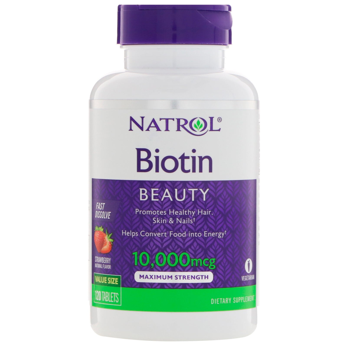 Beauty Promotes Healthy, Hair , Skin & Nails Helps Convert Food Into Energy Natural Flavor Maximum Strength Value Size Vegetarian Dietary Supplement Natrol Biotin 10,000 mcg Fast Dissolve: Promotes health hair, radiant skin and stronger nails. Helps support energy metabolism and aids in the conversion of food into energy. Fast dissolve form - take anytime, anywhere, no water needed. Clinical studies have shown that those deficient in Biotin can experience hair loss and brittle nails.