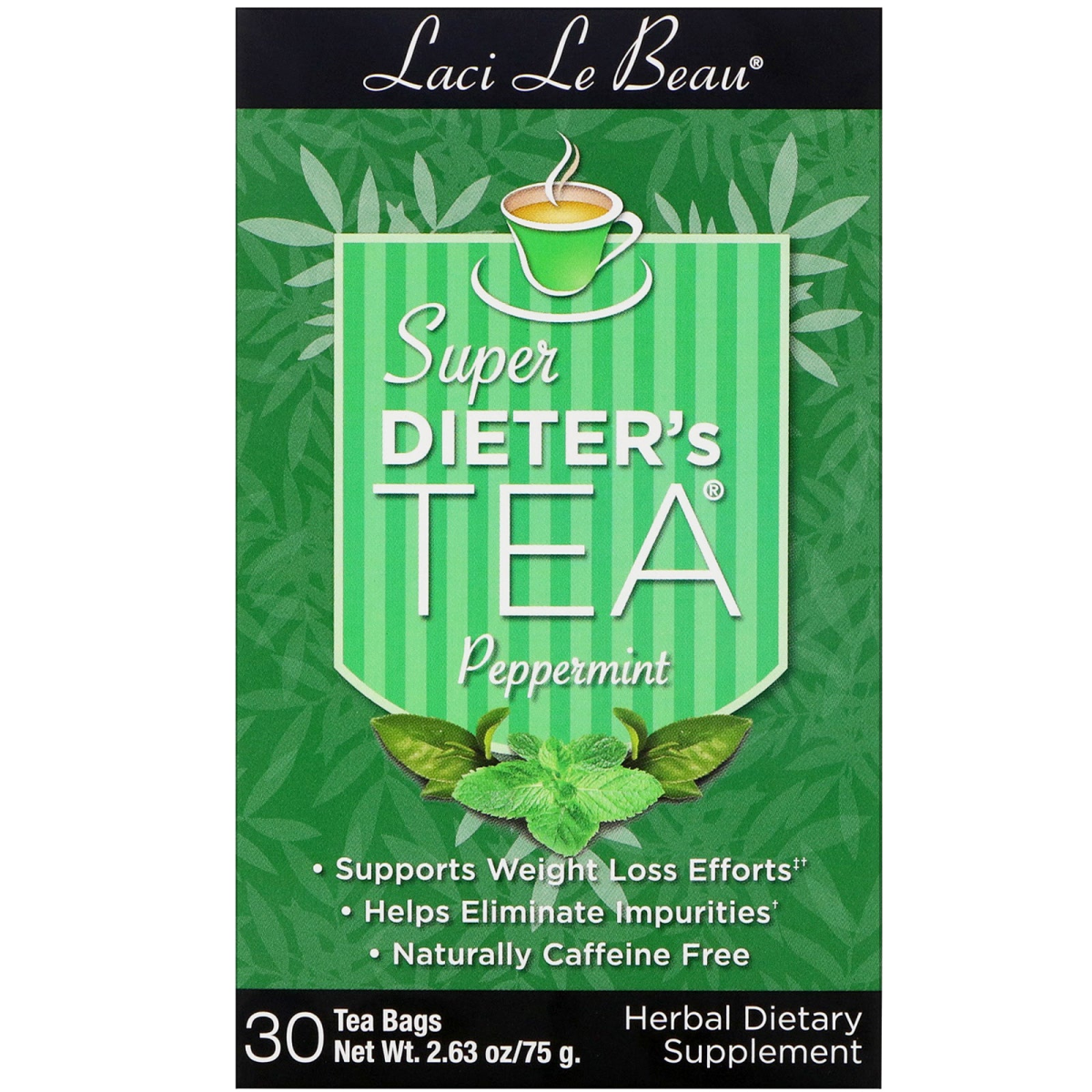 Supports Weight Loss Efforts‡ Helps Eliminate Impurities Naturally Caffeine Free Herbal Dietary Supplement All Natural No Artificial Ingredients It's Tea Time Laci's Super Dieter's Tea blends nature's finest botanicals to create a tea with inspiring aromas and all natural ingredients. Laci Le Beau Natural Botanicals Herbal Tea combines tangy orange and sweet papaya, spearmint, licorice root and cinnamon with chrysanthemum and a touch of honeysuckle. To complete this blend we have also added senna leaf which will help cleanse your body of impurities and support your weight loss efforts. Your Diet is in the Bag "All good things (even your diet) start with a cup of tea." - Laci ‡ This product is to be used in conjunction with a healthy calorie reduction and exercise program. Individual results may vary.