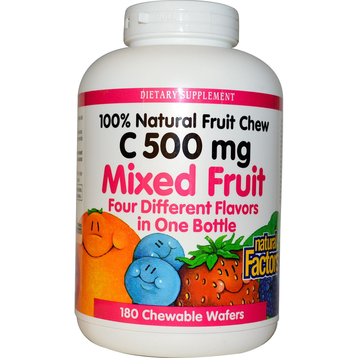 Dietary Supplement 100% Natural Fruit Chew Four Different Flavors In One Bottle Purity & Potency Guaranteed Natural Factors delicious chewable vitamin C wafers are naturally fruit flavored. Vitamin C is an important antioxidant that helps protect the body against environmental pollutants and deficiencies in the daily diet. All Natural Factors products are manufactured in accordance with the Government of Canada's Good Manufacturing Practices (GMP), among the highest standards in the world.