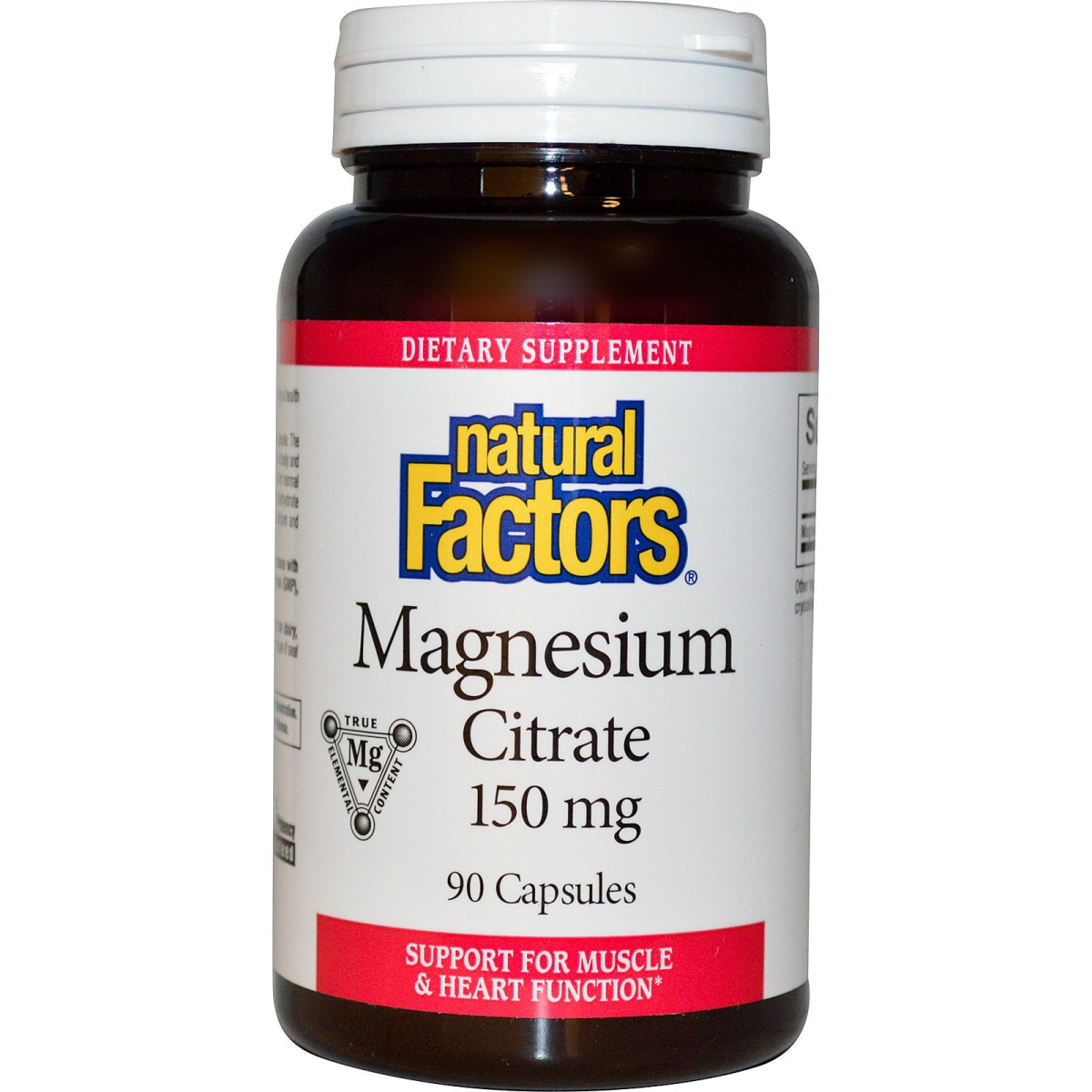 Dietary Supplement Mg True Elemental Content Support for Muscle and Heart Function Purity & Potency Guaranteed Natural Factors Magnesium Citrate is in an easy-to-swallow capsule. The citrate form is extremely well absorbed and well-tolerated by the body and is necessary for hundreds of enzyme reactions in the body and for normal heart function. It is necessary for protein synthesis, carbohydrate metabolism, proper muscle function and helps to absorb calcium and potassium. All Natural Factors products are manufactured in accordance with the Government of Canada's Good Manufacturing Practices (GMP), among the highest standards in the world.