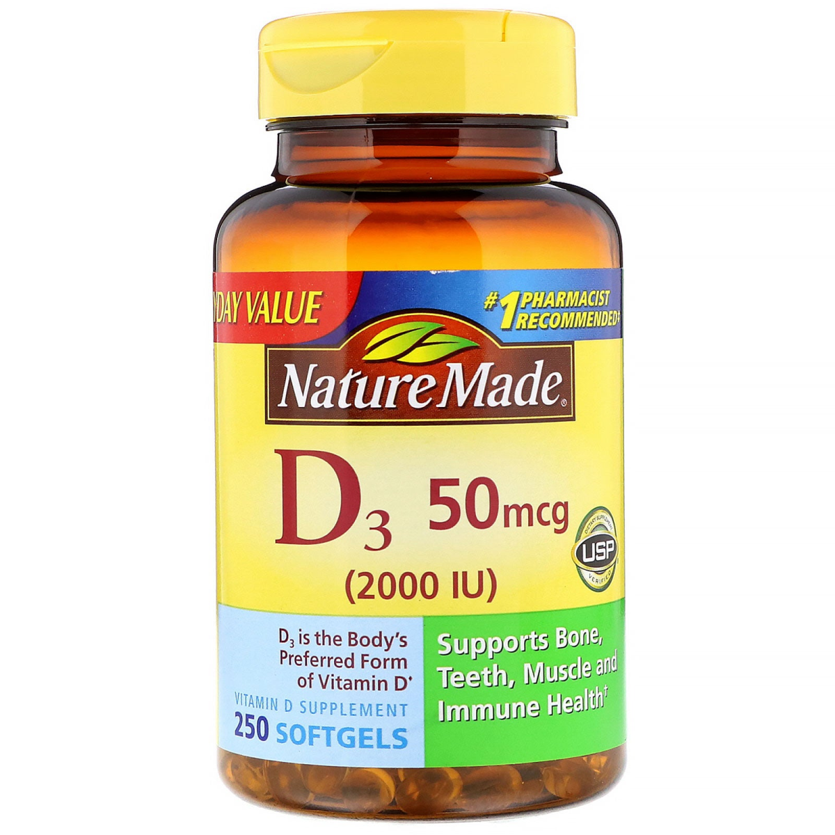 Everyday Value #1 Pharmacist Recommended‡ Dietary Supplement - USP Verified D3 is the Body's Preferred Form of Vitamin D^ Supports Bone, Teeth, Muscle, and Immune Health Vitamin D Supplement ^Vitamin D3 is more effective than vitamin D2 at raising and maintaining adequate levels of circulating vitamin D in the body. ‡Based on Pharmacy Times Survey of pharmacists recommending Letter Vitamin Supplements.