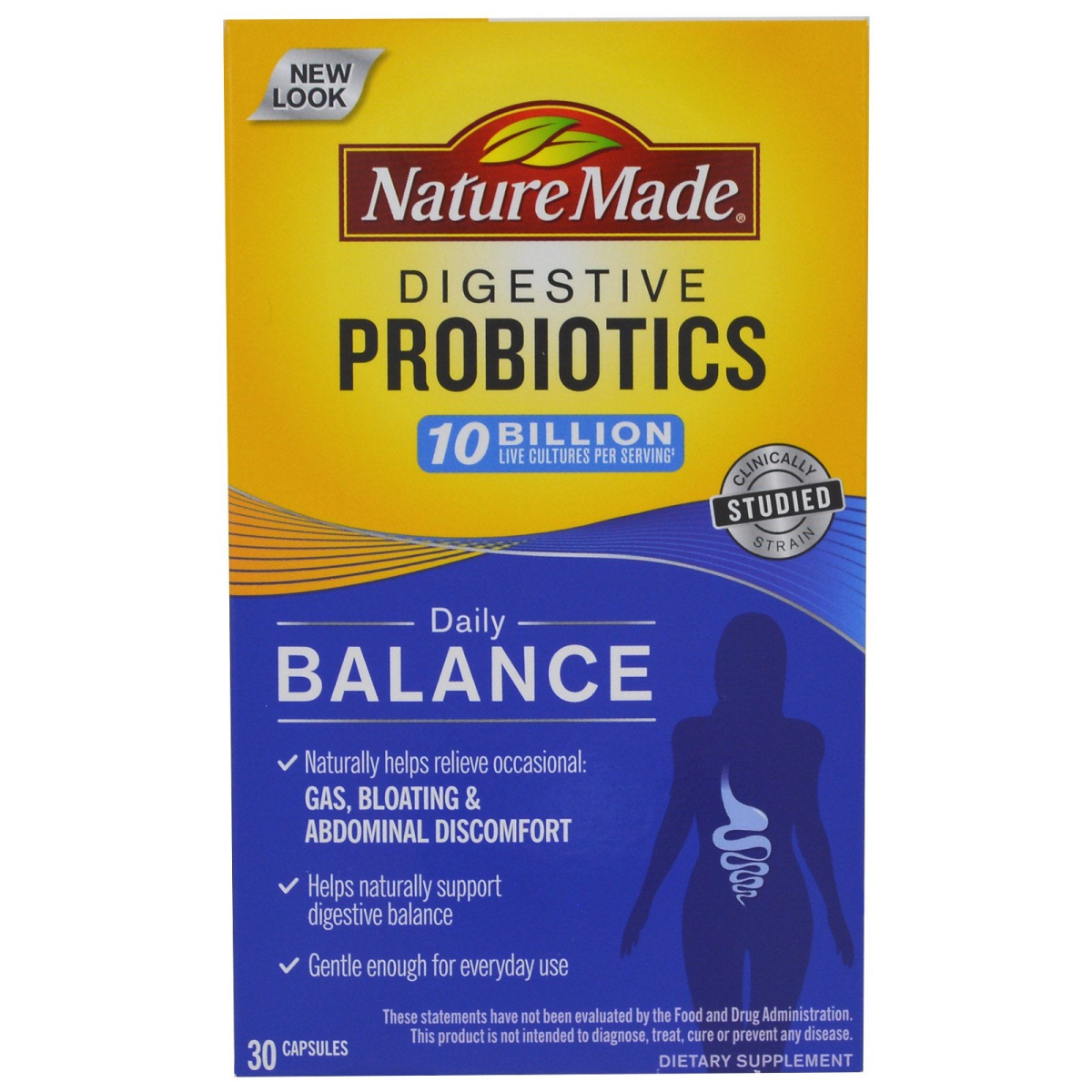 10 Billion Live Cultures per Serving‡ Clinically Studied Strain Naturally Helps Relieve Occasional: Gas, Bloating & Abdominal Discomfort Helps Naturally Support Digestive Balance Gentle Enough for Everyday Use Dietary Supplement Why Take Daily Balance Probiotics? A high functioning digestive tract is important for overall health and wellness. Nature Made Daily Balance helps naturally support digestive balance and helps build and support a healthy digestive system. Each capsule is formulated with 10 billion live cells of the Probi Digestis probiotic strain Lactobacillus plantarum 299v. ‡ Just one capsule daily, Nature Made Daily Balance naturally helps relieve occasional gas, bloating, and abdominal discomfort while helping to support a healthy digestive system. Why Nature Made Probiotics? Gentle enough for everyday use Clinically efficacious dose Guaranteed potency until expiration‡ A brand with a 40-year heritage Each capsule contains a minimum of 10 billion live cells of Lactobacillus plantarum 299v at time of expiration.‡ Just one capsule daily. ‡Formulated to provide at least 10 billion live cells per capsule if continuously stored in a cool, dry place at or below 77ºF (25ºC) and consumed prior to expiration date. Storage and handling conditions can vary, and may affect the total amount of cells delivered at time of consumption.