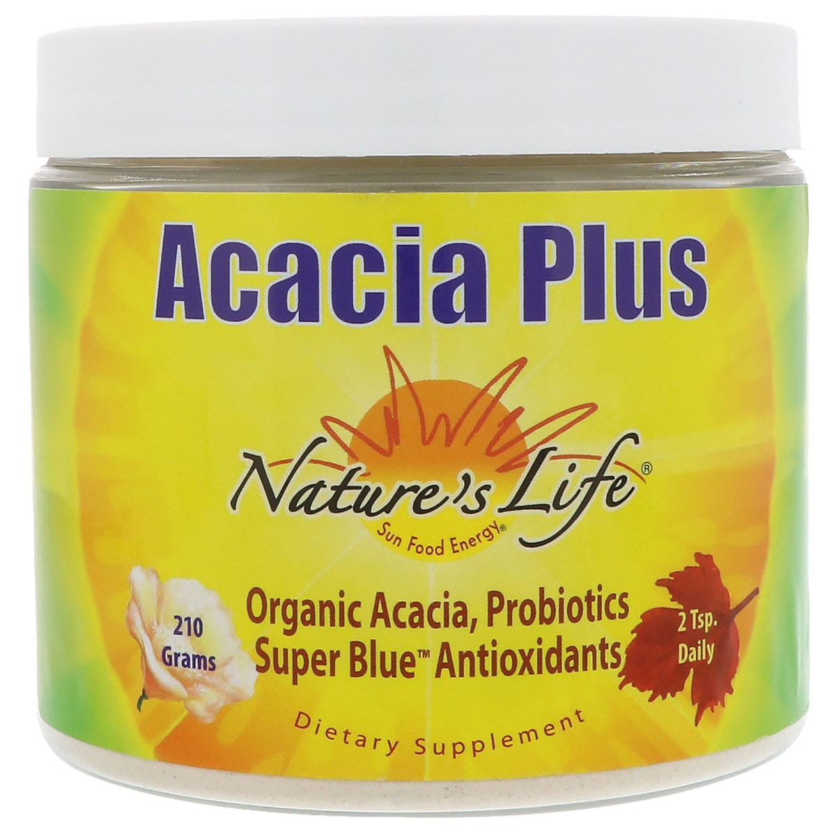 Delicious Cinnamon Honey Lemon 30 Servings Sun Food Energy Organic Acacia, Probiotics Super Blue Antioxidants Dietary Supplement 2 Tsp. Daily Quality You Can Trust Acacia is used as a fiber supplement intended to support a healthy GI tract. Acacia Plus also includes Nature Life's Proprietary Super Blue Antioxidant Blend and a Probiotic Blend including 12 strains.