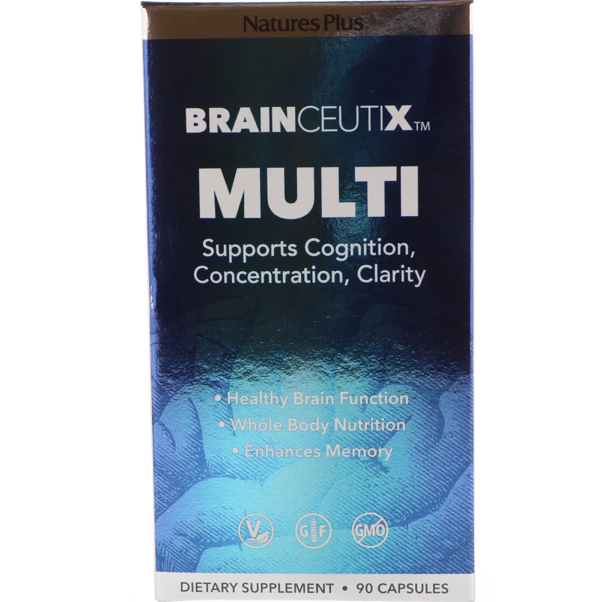 Supports Cognition, Concentration, Clarity Healthy Brain Function Whole Body Nutrition Enhances Memory Vegan Gluten Free Non GMO Dietary Supplement High Potency Vitamins, Phytonutrients, Nootropics and Antioxidants New BrainCeutix Multi by Nature's Plus delivers optimizing nutrition to invigorate healthy total mind-body function. BrainCeutix Multi is formulated with high potency vitamins, powerful phytonutrients and an array of natural nootropics (brain nutrients) so you can energetically perform at peak focus, memory and problem solving abilities. BrainCeutix Multi features: PCQ (Pyrroloquinoline quinone) promotes brain energy for memory and cognition Phosphatidylserine for brain cell flexibility and communication Alpha Lipoic, R-Lipoic, Selenium and CoQ10 for superior antioxidant protection Acetyl-L-Carnitine (ALC) to support optimal brain cell membrane health. BrainCeutix Multi: the perfect balance of total mind-body nutritional support for vibrant health and invigorated wellness. While common supplements supply the basic nutrients for general health, BrainCeutix formulas are carefully crafted to deliver the best in cutting-edge, clinically documented, highly effective ingredients and are synergistically formulated to optimize brain function. BrainCeutix Multi offers unique features: Gluten-Free - Free from gluten of all sources, including wheat, barley and spelt. Non-GMO - Free from any genetically modified ingredients or organisms Allergen-Free - Free from all major food allergens (per FALCPA regulations) Vegetarian - Made from vegetarian ingredients, including vegetarian capsules