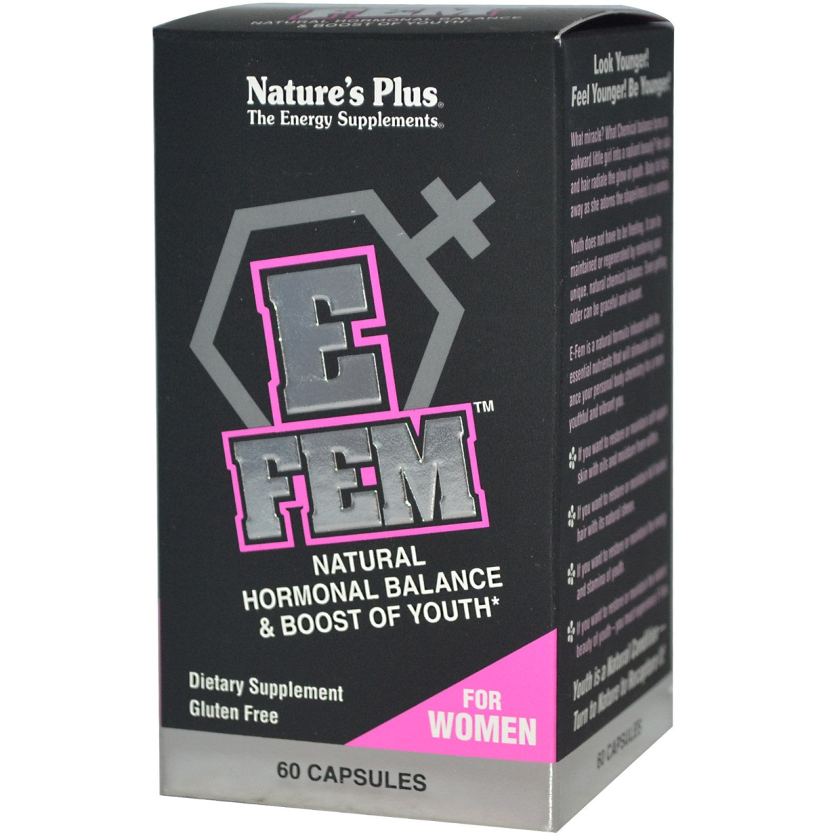 The Energy Supplements Natural Hormonal Balance & Boost of Youth Dietary Supplement Gluten Free Patent Pending Look Younger! Feel Younger! Be Younger! What miracle? What Chemical balance turns an awkward little girl into a radiant beauty? Her skin and hair radiate the glow of youth. Baby fat falls away as she adorns the shapeliness of a woman. Youth does not have to be fleeting. It can be maintained or regenerated by restoring your unique, natural chemical balance. Even getting older can be graceful and vibrant. E-Fem is a natural formula infused with the essential nutrients that will stimulate and balance your personal body chemistry for a more youthful and vibrant you. If you want to restore or maintain soft supple skin with oils and moisture from within. If you want to restore or maintain full bodied hair with its natural sheen. If you want to restore or maintain the energy and stamina of youth. If you want to restore or maintain the natural beauty of youth - you must experience E-Fem. Youth is a natural condition— Turn to nature to recapture it! Natural support for natural hormonal balance and longevity