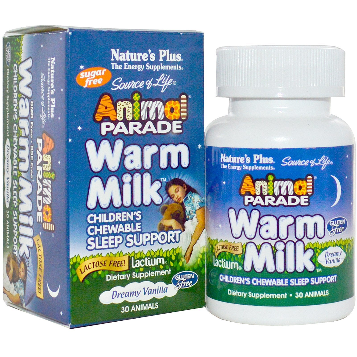 The Energy Supplements Sugar Free Sleep Support Lactose Free! Lactium Dietary Supplement Gluten Free Nutritional Support for Healthy Sleep Function These days much of the comforting warmth of bedtime is lost in the hustle of day-to-day life. That's why Nature's Plus has formulated Source of Life Animal Parade Warm Milk Chewables, the perfect bedtime complement. Each incredibly delicious, dreamy vanilla serving contains 167 mg of Lactium, the same sleep-promoting protein found in the warm milk that parents have used for generations. Count on Animal Parade Warm Milk Chewables for the kind of comfort that always leads to sweet dreams.