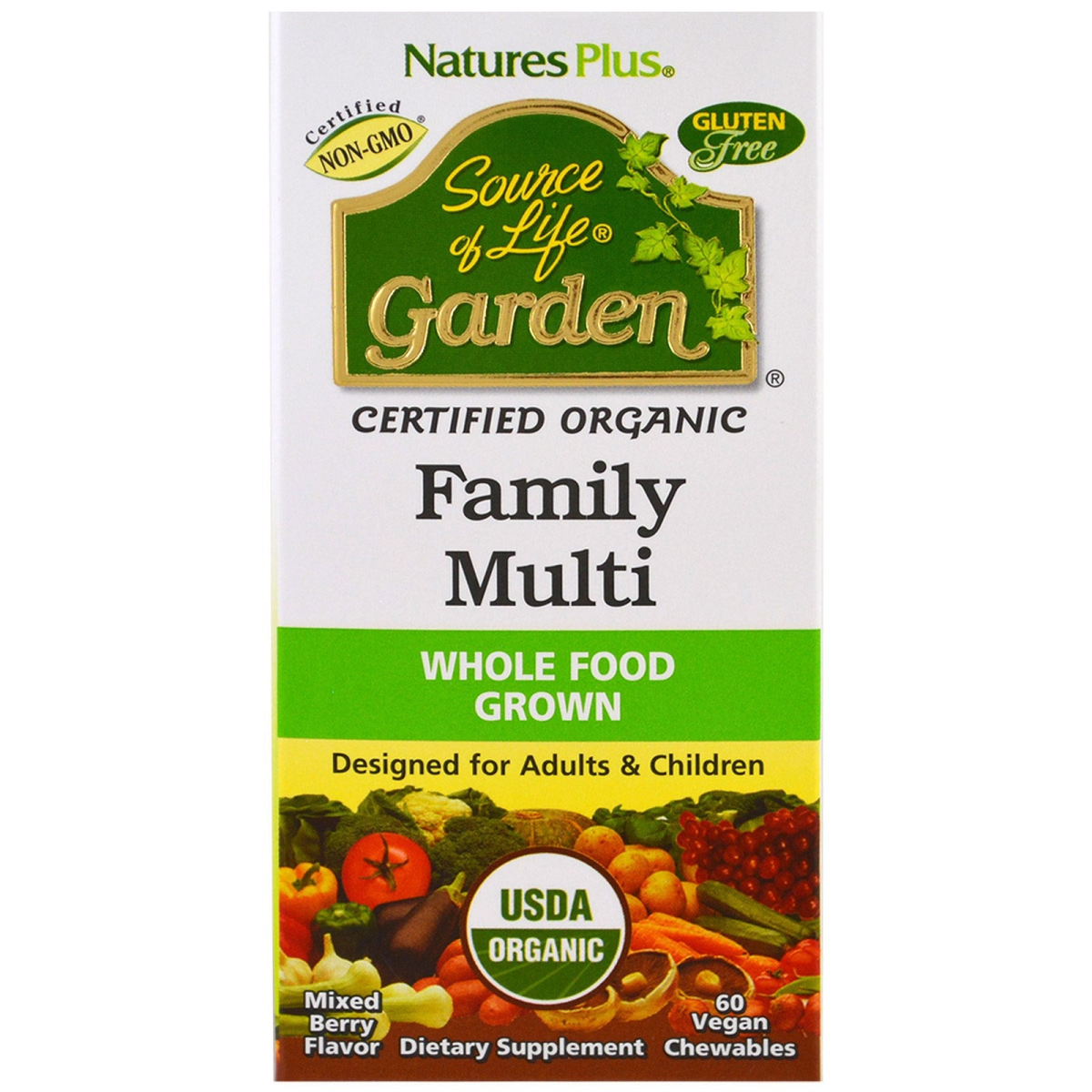 Certified Non-GMO Gluten Free Certified Whole Food Grown Designed for Adults & Children USDA Dietary Supplement Yeast Free Vegan Certified by Ecocert ICO Certified Nutritional Support for General Health, Energy, Strength, Stamina, Heart Function and Metabolism Nature's Plus Source of Life Garden Family Multivitamin elevates your health to new heights, optimizing your whole-body wellness with the amazing power of real, certified fruit and vegetable nutrition. With the high quality and exceptional purity of this certified supplement, Source of Life Garden Family Multi is unrivaled in its ability to nourish your body. Each delicious, mixed-berry chewable is packed with pure, natural and healthy goodness that it is perfect for children, parents and even grandparents! Discover the difference Source of Life Garden Family Multivitamin can make in your family life! Vegan, non-gmo and certified Yeast free and gluten free Essential vitamins and minerals 5000 total ORAC Enhance your Life, Protect your family's health and nourish your most precious investments...with source of life garden family multi. Certified , delivering certified goodness! Made from Over 20 Whole Foods USDA - USDA NOP Certification guarantees the pure and wholesome status of this formula, made without synthetic/chemical pesticides and artificial fertilizers. Certified Non-GMO - Independently tested and independently certified to be free from genetically modified materials and materials associated with GM organisms. Vegan - Made without animal-derived ingredients Gluten Free - Made without wheat, barley, or any gluten contributors, and independently assayed and verified to meet all gluten-free standards. Yeast Free - Designed and produced without any yeast or yeast byproducts and therefore free from the many potential side effects of yeast. Independently GMP Certified - Manufacturing facility independently certified to meet stricter Good Manufacturing Practices (GMPs) than U.S. law requires. FALCPA Allergen Free
