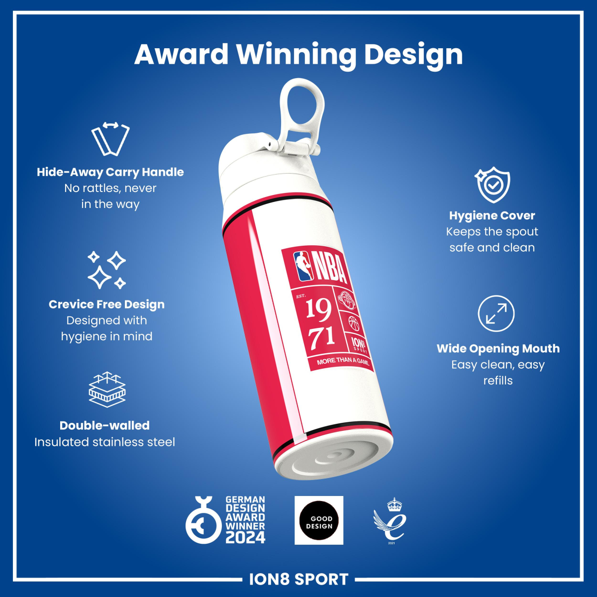 Raise your game with the Official NBA Thermal Insulated Bottle by ION8. Designed to meet the uncompromising standards of NBA, this 750ml double-wall stainless steel bottle combines premium performance with unmistakable NBA pride.