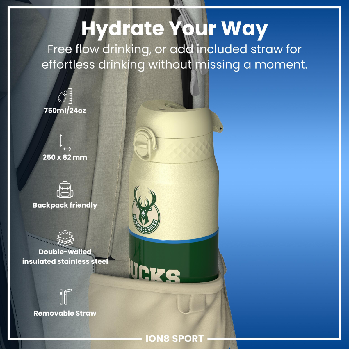 NBA x ION8, Insulated Steel Bottle, Milwaukee Bucks, 750ml (24oz)