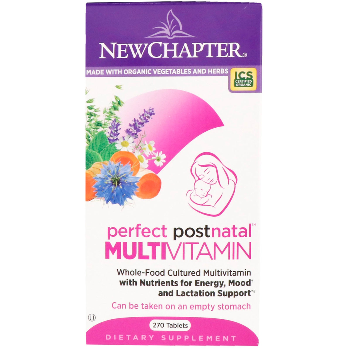 Made with Organic Vegetables and Herbs Whole-Food Cultured Multivitamin with Nutrients for Energy, Mood, and Lactation Support Can be Taken on an Empty Stomach Kosher Dietary Supplement Certified Organic by International Certification Services, Inc. Gluten Free 100% Vegetarian No Artificial Flavors or Colors Non-GMO Project Verified New Chapter's Guiding Principles To Deliver the Wisdom of Nature thus relieving suffering and promoting optimal health To advance the organic mission, nourishing body and soul with the healing intelligence of pure whole foods and herbal supplements To nurture and sustain Mother Earth, the source of natural healing To honor and reward personal growth, for enlightened teamwork depends on the vitality of every member of the New Chapter family Holistic: New Chapter Whole-Food Probiotic-Cultured Multis: More Than Food Supplements, They’re Supplemental food. Probiotic-Cultured - Fermented with Beneficial Live Probiotics Non-GMO Project Verified - Made with Organic Vegetables and Herbs Whole-Food Complexed - Can Be Taken on an Empty Stomach Health: Nutrients for Breast Milk- Perfect Postnatal multivitamin is formulated with vitamins and minerals recommended specifically for breastfeeding women, including whole-food cultured Iron, Vitamin B6, Iodine and Vitamin D3. Body Nourishing – To help address your body’s needs after giving birth, Perfect Postnatal delivers whole-food cultured Iron‡ - required for red blood cell production – as well as Folate. Energy & Mood Support – Whole–food cultured B Vitamins work naturally with your body to support energy needs during early motherhood and breastfeeding, while emerging studies suggest that taking a daily multivitamin can support a healthy mood and help with occasional stress and fatigue. Postnatal Herbal Blend – Perfect Postnatal features a complementary blend of botanicals traditionally used by breastfeeding women, including, organic Oat, organic Turmeric and organic Chamomile. Gentle & Convenient – This multivitamin with organic ingredients helps busy moms get consistent nutritional support and can be taken anytime – even on an empty stomach! ‡ Not a sole source of this nutrient; a healthy diet is also important.