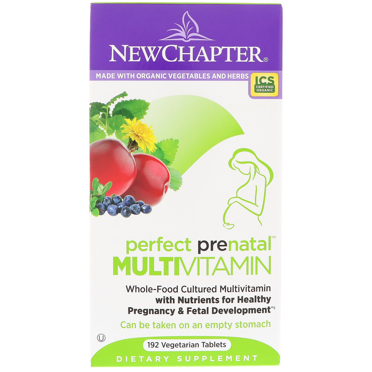 Made with Organic Vegetables and Herbs ICS Certified Organic Whole-Food Cultured Multivitamin with Nutrients for Healthy Pregnancy & Fetal Development§ Can Be Taken on An Empty Stomach Kosher Dietary Supplement Non GMO Project Verified 100% Vegetarian Gluten Free Certified Organic by International Certification Services New Chapter's Guiding Principles To deliver the wisdom of nature thus relieving suffering and promoting optimal health. To advance the organic mission, nourishing body and soul with the healing intelligence of pure whole foods and herbal supplements. To nurture and sustain Mother Earth, the source of naturel healing. To honor and reward personal growth, for enlightened teamwork depends on the vitality of every member of the New Chapter family. Certified B Corporation New Chapter is proud to be a Certified B Corp, using business as a force for good. §Healthy Pregnancy Support Before Pregnancy - Taken before conception, Perfect Prenatal provides key nutrients, such as whole-food cultured Folate that helps support health birth weight and development of baby's brain and spinal cord. During Pregnancy - Formulated specifically to nourish mother and baby, whole-food cultured nutrients support a healthy, pregnancy, complemented by our targeted prenatal blend of organic cultured herbs. Energy Support - For support before, during and after pregnancy, Perfect Prenatal provides whole-food cultured B vitamins that help your body naturally produce energy. Fetal Oxygen Transport - Whole-food cultured Iron helps transport oxygen to your growing need for iron increases significantly during pregnancy - and Perfect Prenatal provides 100% Daily Value. Gentle & Convenient - Once-per meal formula with organic ingredients can be taken anytime - even on an empty stomach!