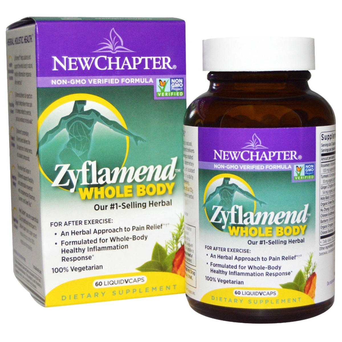 Certified B Corporation Non-GMO Verified Formula Our #1 Selling Herbal 100% Vegetarian Dietary Supplement New! Liquid VCaps - 100% Vegetarian Product Naturally Gluten Free For After Exercise: An Herbal Approach to Pain Relief†Formulated for Whole-Body Healthy Inflammation Response 10 Pure Herbs, One Potent Formula Chinese Skullcap Chinese Goldthread Ginger Rosemary Turmeric Holy Basil Green Tea Hu Zhang Barberry Oregano Power of 10 Herbs Zyflamend Whole Body is our herbal formula for pain relief†after exercise. Zyflamend's ten herbs have been traditionally used to support health and well-being. Chinese Goldthread, Hu Zhang, Chinese Skullcap and Barberry are time-honored tonic herbs in the Chinese herbal tradition. Rosemary and Oregano are native to the Mediterranean region. Zyflamend's Hu Zhang is a natural source of resveratrol, a part of the healthy Mediterranean diet. Turmeric, Ginger, Green Tea and Holy Basil are common elements in Asian and Indian wellness regimes. Herbal. Holistic. Health. Healthy Inflammation Response - Zyflamend helps balance and support the whole body's natural, healthy inflammation response after exercise. Herbal Pain Reliever - Zyflamend delivers full-spectrum Ginger to help relieve minor pain or soreness related to exercise, such as a workout or brisk walk. Power of 10 Herbs- Zyflamend's proprietary 10-herb blend delivers the full-spectrum of whole herbs, not isolated compounds. Keeps You Moving- The whole-food Ginger in Zyflamend supports flexibility and comfortable movement with complementary Rosemary, Turmeric and Green Tea. Super Pure & Potent - New Chapter uses only supercritical CO2 or traditional techniques to deliver super-pure, super-potent herbal extracts in this 100% vegetarian formulation. †Occasional pain
