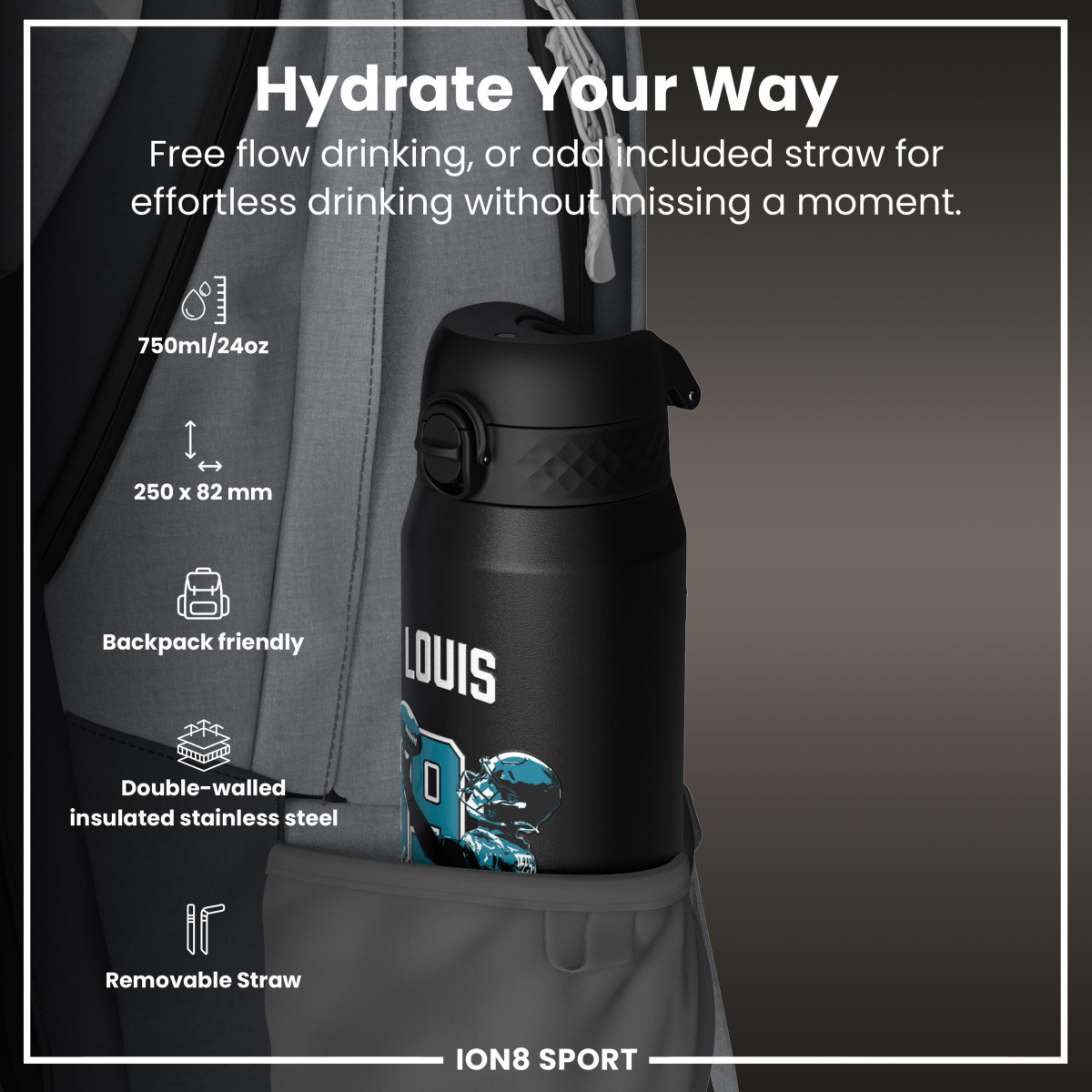 NFL x Ion8 Sports, Insulated Bottle, Locked In Series, Ress-Zammit, 750ml (24oz)
