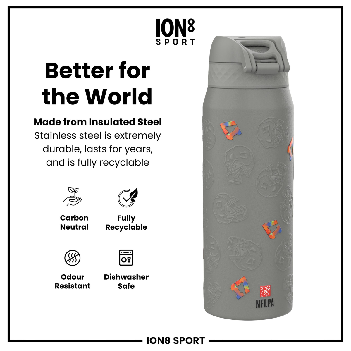 Raise your game with the Official NFL Thermal Insulated Bottle by ION8. Designed to meet the uncompromising standards of NFL, this 750ml double-wall stainless steel bottle combines premium performance with unmistakable NFL pride.