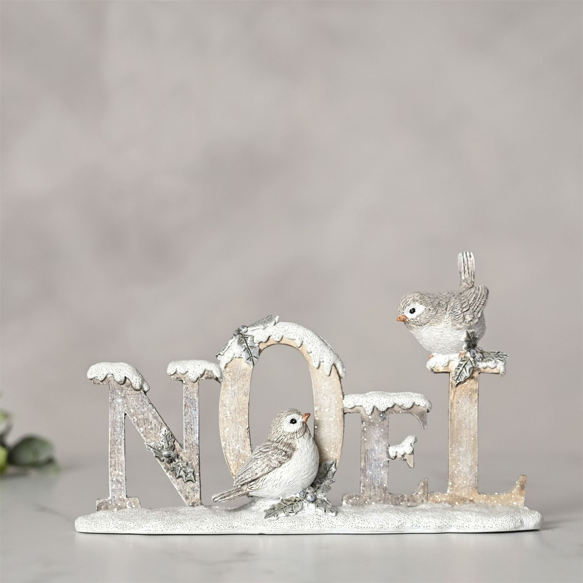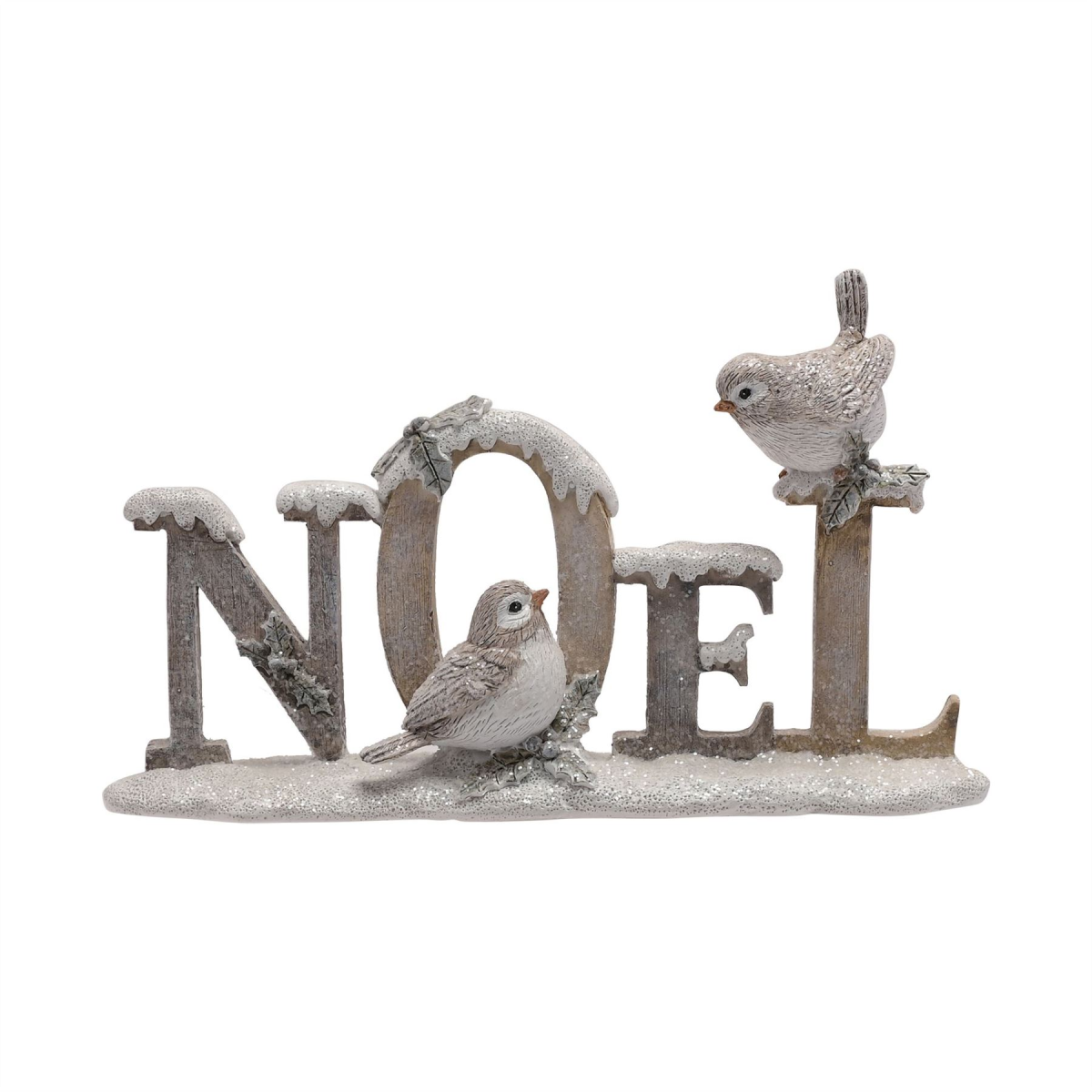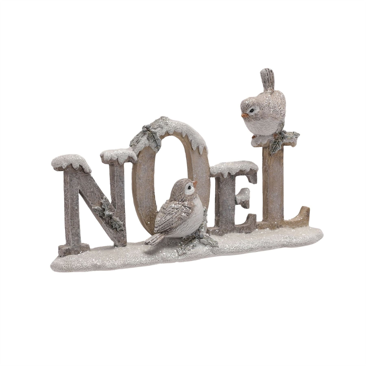 A Noel figurine from THE SEASONAL GIFT CO�. This adorable decoration will help to create a magical Winter Wonderland at home this festive period. The white resin figurine showcases snow-topped �Noel� lettering, complete with robins. It is completed by a frosted finish with glitter touches. The figurine is packaged in a brown box inner with 4c colour sticker.