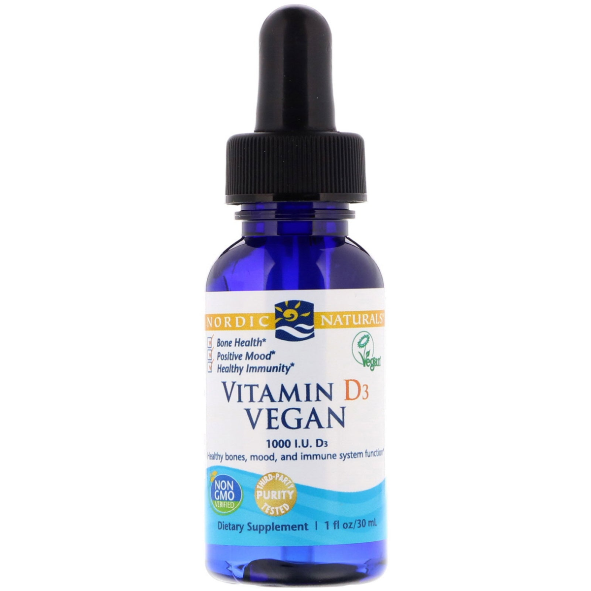 Dropper for Easy Dosing Bone Health Positive Mood Healthy Immunity Vegan 1000 I.U. D3 Non-GMO Verified Third-Party Purity Tested Dietary Supplement Contains Vitashine D3 Registered Vegan 100% vegan vitamin D3 for healthy bones, mood, and immune system function. . Supports Calcium Absorption for Bone Health Helps Regulate Mood and Sleep Rhythms Supports Immune System Function Vitamin D has long been known for its important role in regulating calcium and phosphorus levels, and in increasing mineralization in the bones. Nordic Naturals Vitamin D3 Vegan is a unique formula specially developed for vegans and strict vegetarians, and is registered by the Vegan Society. Sourced from lichen, this plant-based liquid formula is in the natural form of vitamin D (cholecalciferol), and is a better absorbed and utilized form of vitamin D to support bone, mood, and immune health, and to help regulate sleep rhythms.