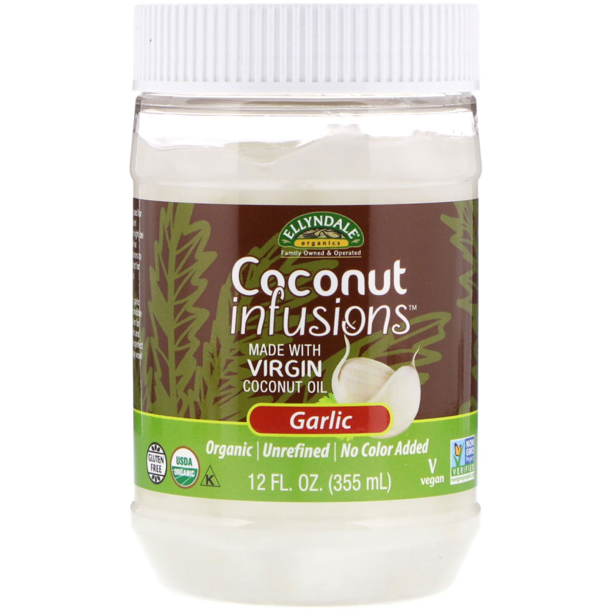Family Owned and Operated Made with Virgin Coconut Oil Organic Unrefined No Color Added Vegan Kosher Gluten Free USDA Organic Non-GMO Project Verified Wow, the wonders of the magical Coconut. It can be used for just about anything and its oil has a high smoke point (approximately 375) and a slew of benefits. It just might be the world's most perfect oil and spread. And now we’ve fused the rich taste of coconut with bold, inspiring flavors to create Ellyndale Organics Coconut Infusions. Perfect for adding a little zest to your dishes and snacks or as a delightful spread. Our garlic infused coconut oil has a striking, savory, garlic flavor that's perfect on popcorn, as a spread or for incredible garlic bread. Its also surprising extra boost of flavor for baking, frying, and sautéing your favorite meats, fish and vegetable. Drizzle a little oil in top when done for the perfect combination of coconut and garlic that will make you say wow!
